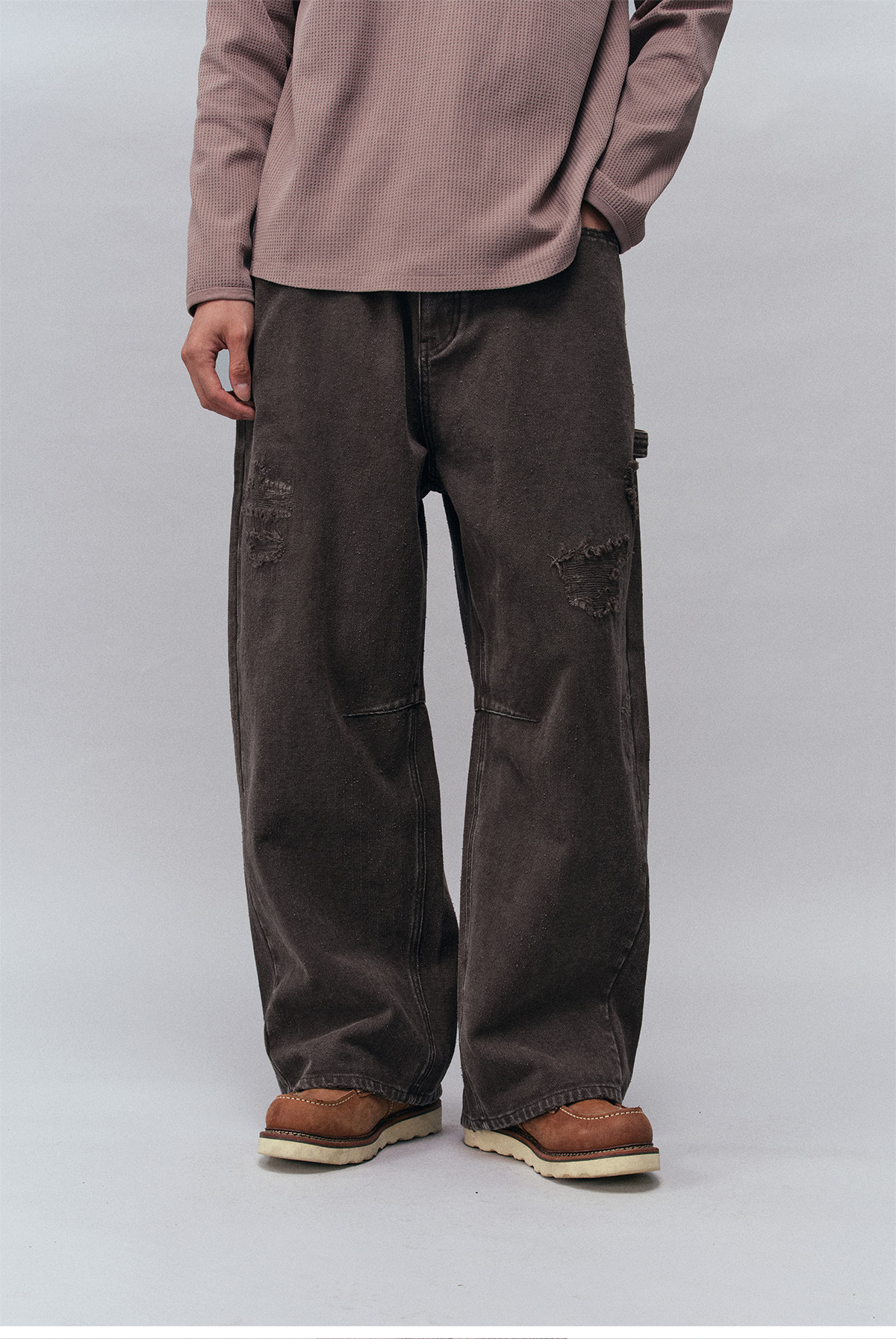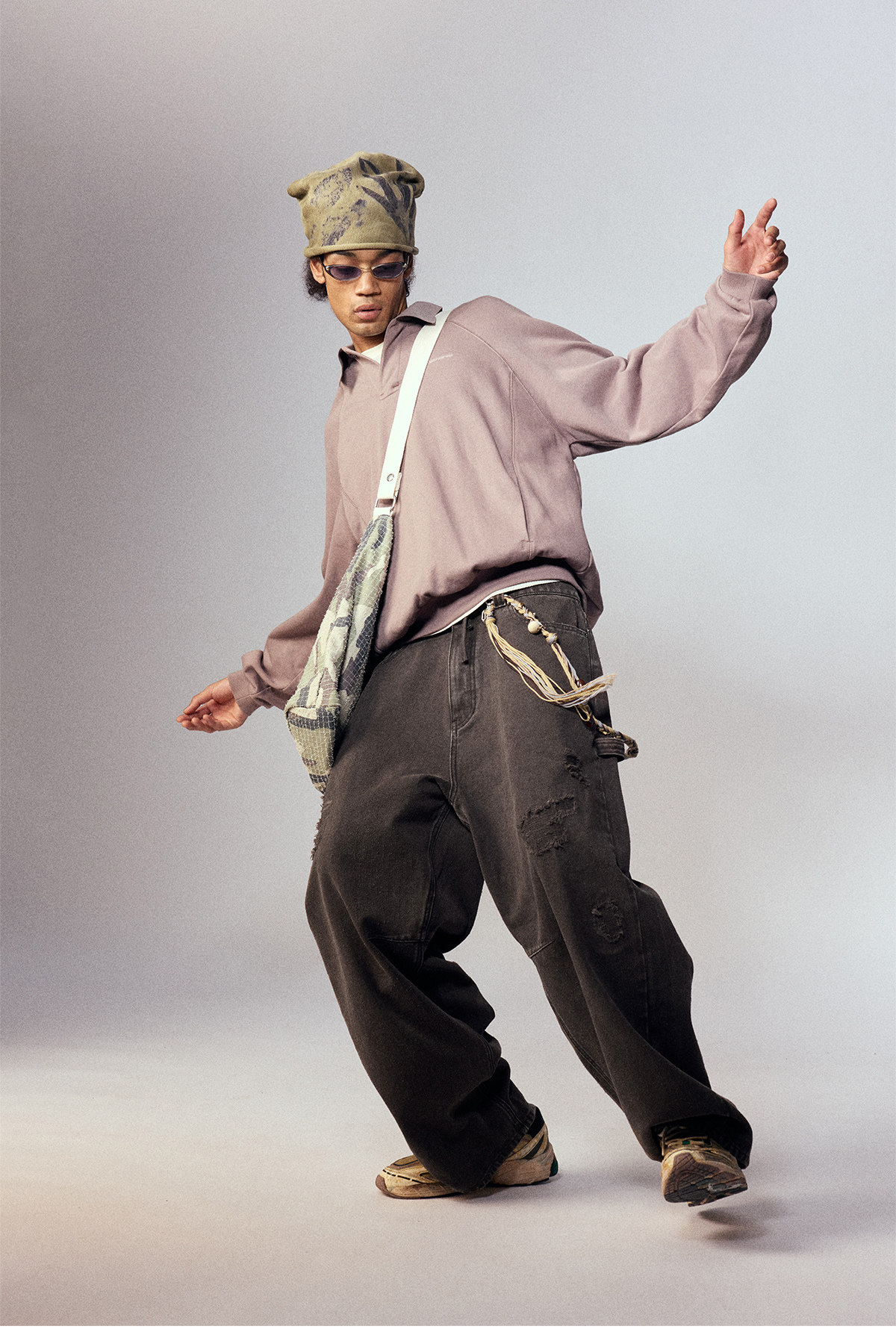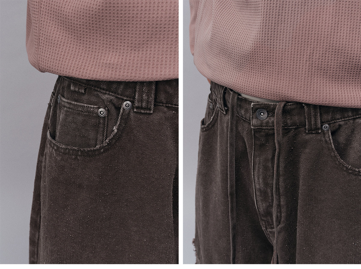 Свободные брюки изогнутого кроя, хорошо адаптируются к различным типам фигур; на поясе предусмотрена регулировка на кулиске для удовлетворения потребностей разных размеров; вытачки в области коленей увеличивают объем, уменьшая сопротивление при ходьбе и делая носку более комфортной; спереди расположены наклонные прорезные карманы, удобные для рук и мелких предметов; окрашивание: применена техника выварки для получения эффекта естественного выцветания, дополненная техникой ручного состаривания, создающей потертости и протертости на штанинах, что придает брюкам ощущение винтажности.