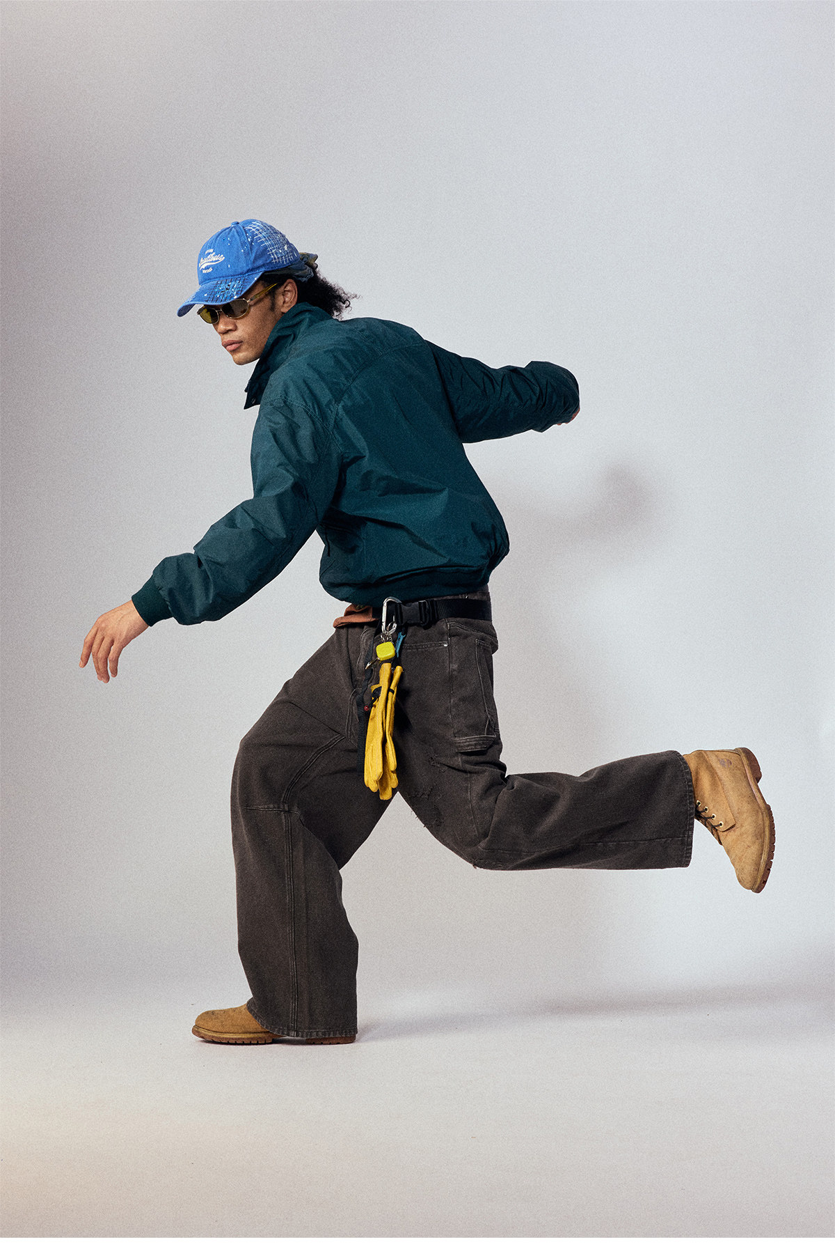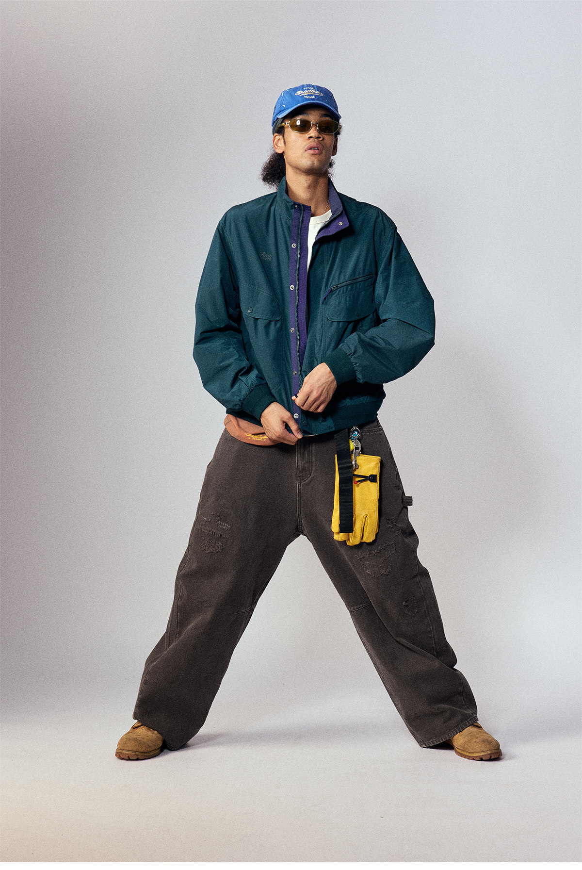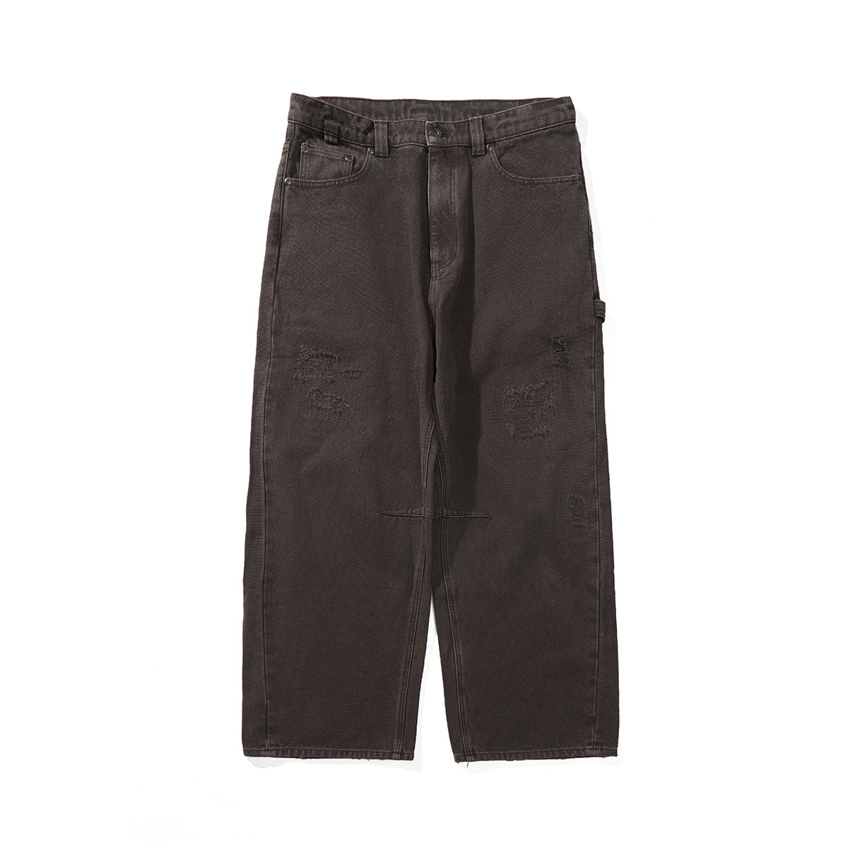 Свободные брюки изогнутого кроя, хорошо адаптируются к различным типам фигур; на поясе предусмотрена регулировка на кулиске для удовлетворения потребностей разных размеров; вытачки в области коленей увеличивают объем, уменьшая сопротивление при ходьбе и делая носку более комфортной; спереди расположены наклонные прорезные карманы, удобные для рук и мелких предметов; окрашивание: применена техника выварки для получения эффекта естественного выцветания, дополненная техникой ручного состаривания, создающей потертости и протертости на штанинах, что придает брюкам ощущение винтажности.