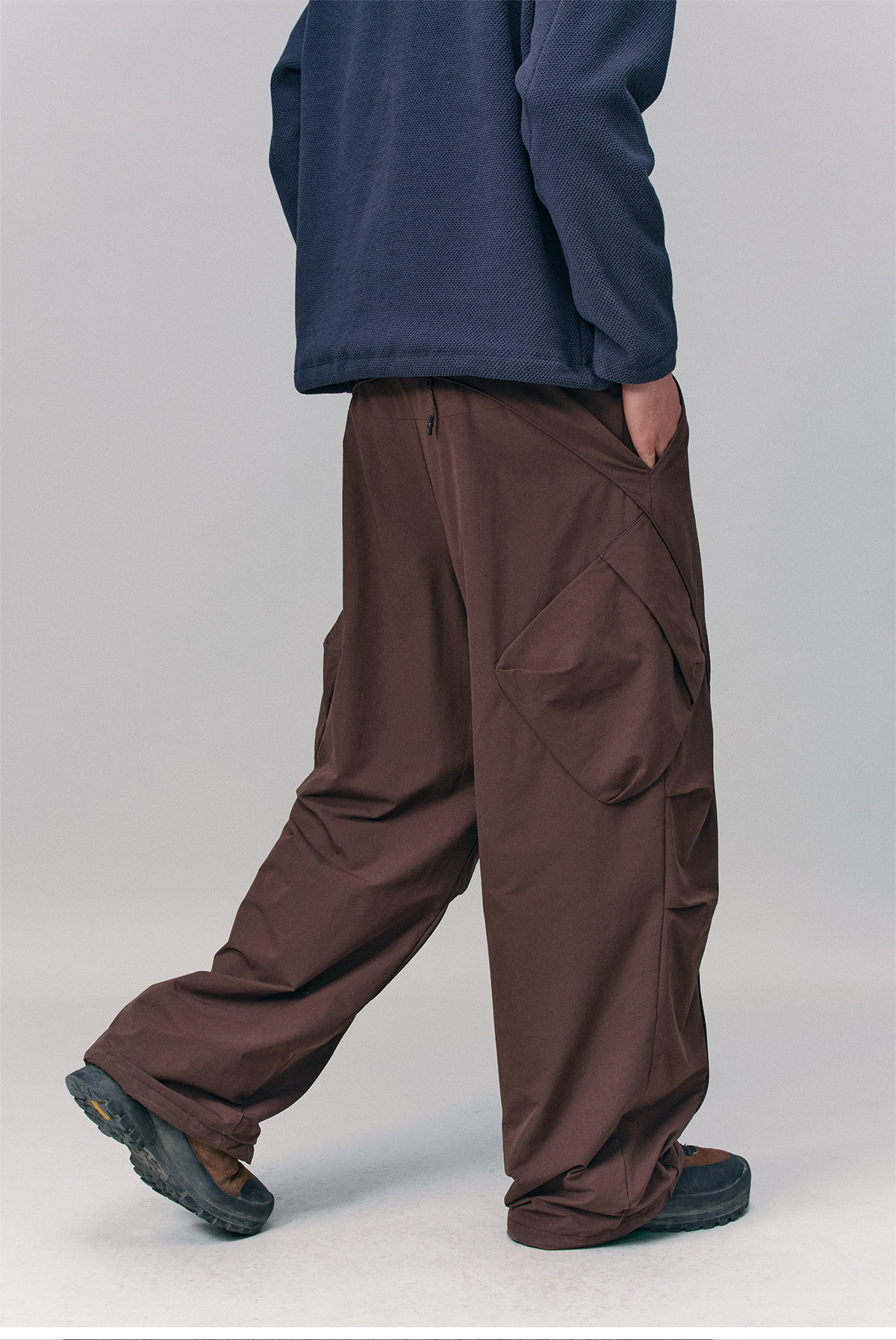 Изогнутые, «ножевидные» плавные линии кроя сочетаются с объемными накладными карманами в стиле workwear, создавая более выразительный силуэт.
