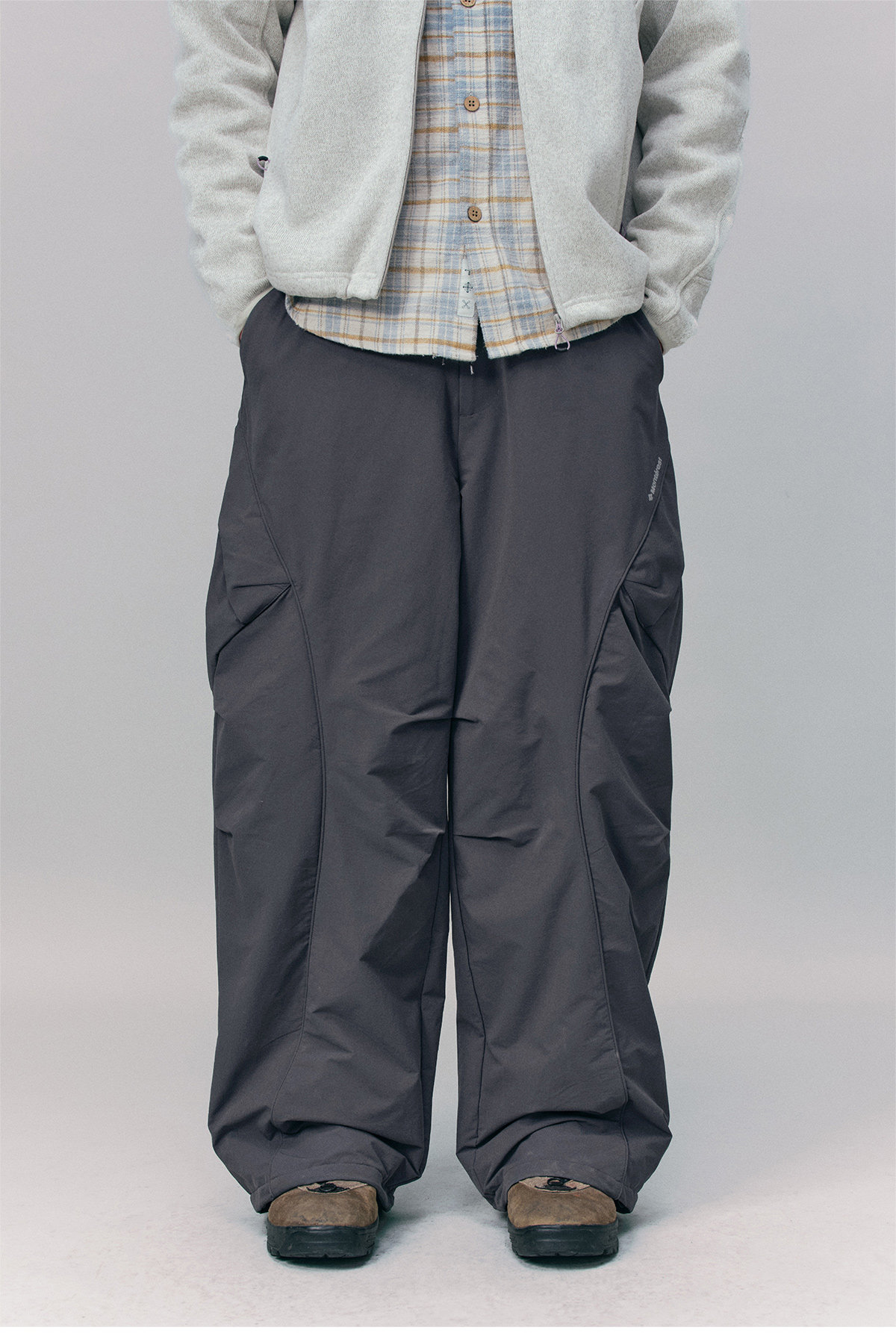 Изогнутые, «ножевидные» плавные линии кроя сочетаются с объемными накладными карманами в стиле workwear, создавая более выразительный силуэт.
