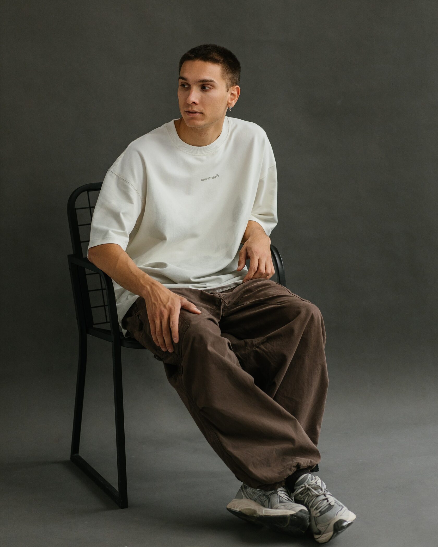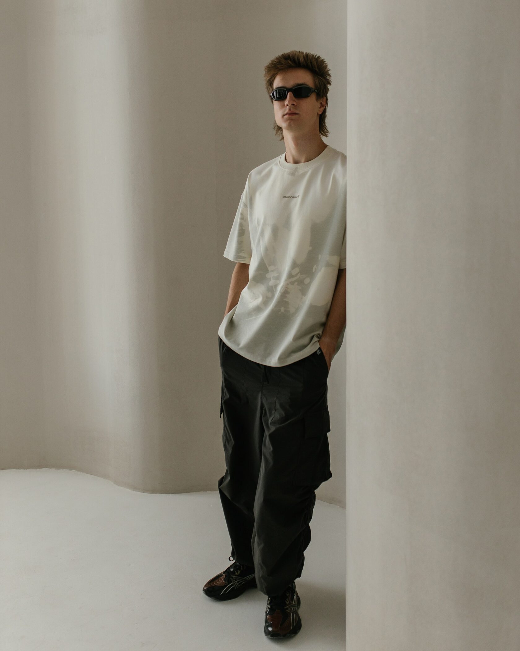 Футболка изготовлена из классической хлопковой ткани с небольшим добавление синтетических волокон для комфортной эксплуатации и исключения растягивания. Дизайн выполнен в качестве минималистичного логотипа в цвет изделия, который становится виден при изменении цвета свитшота.