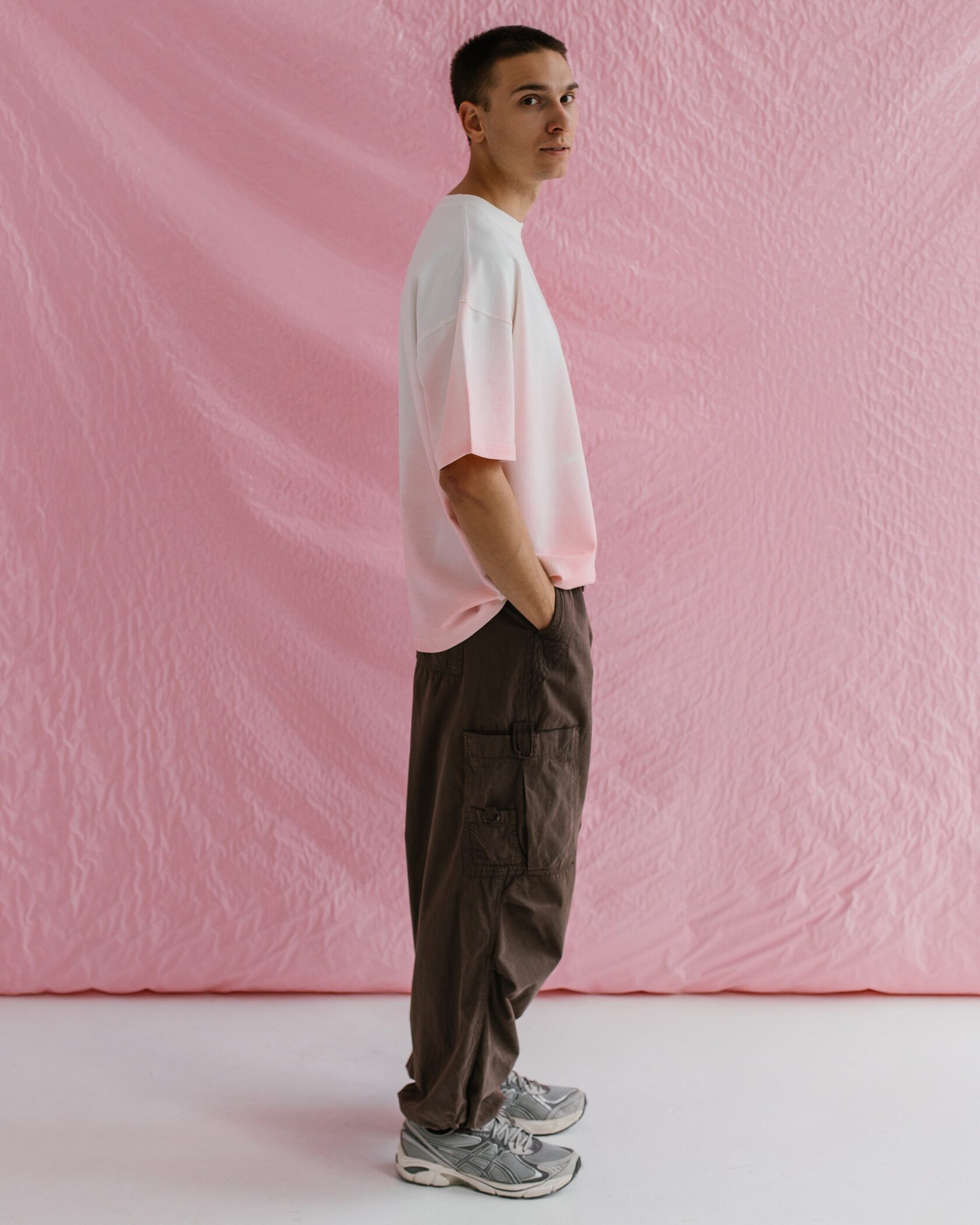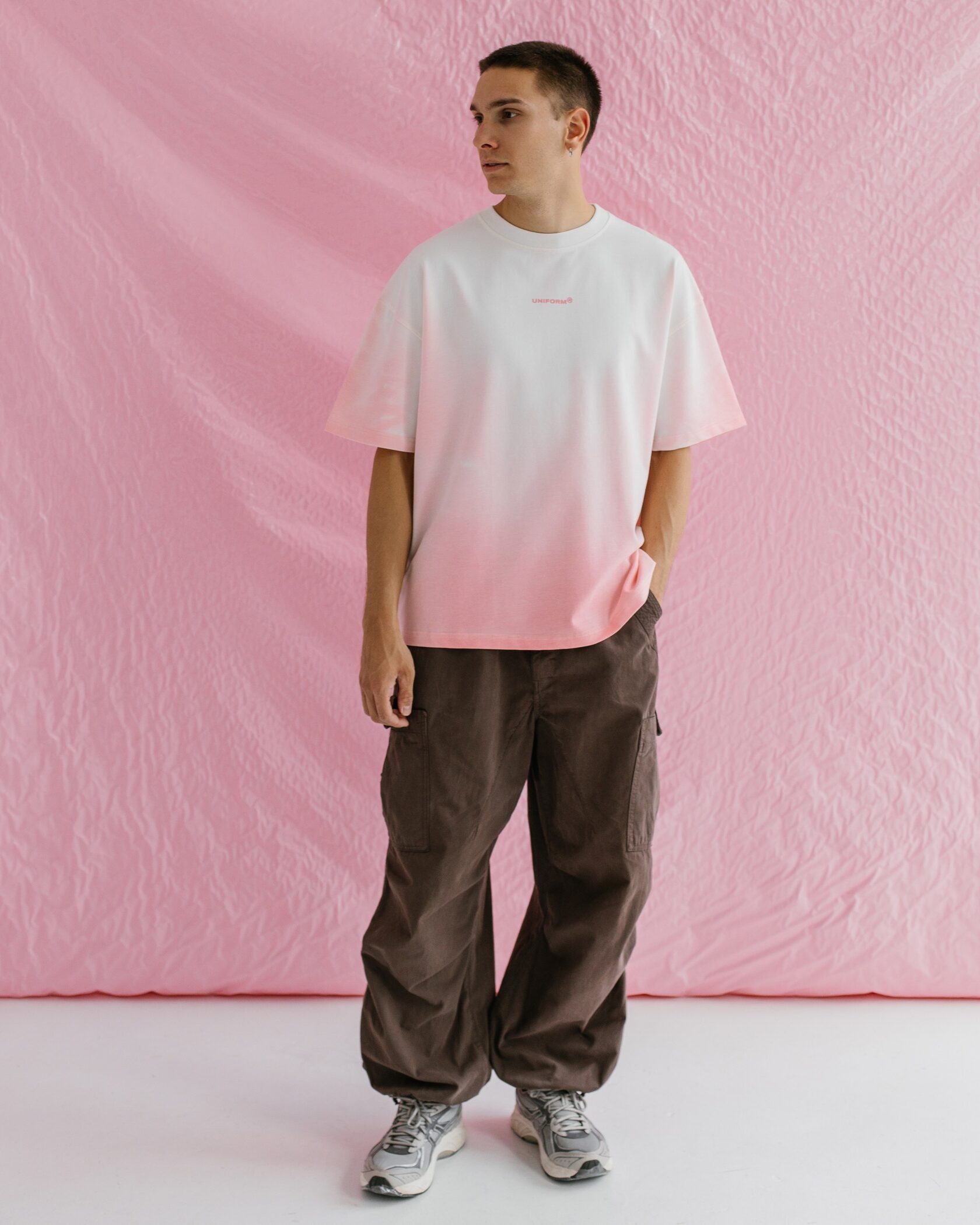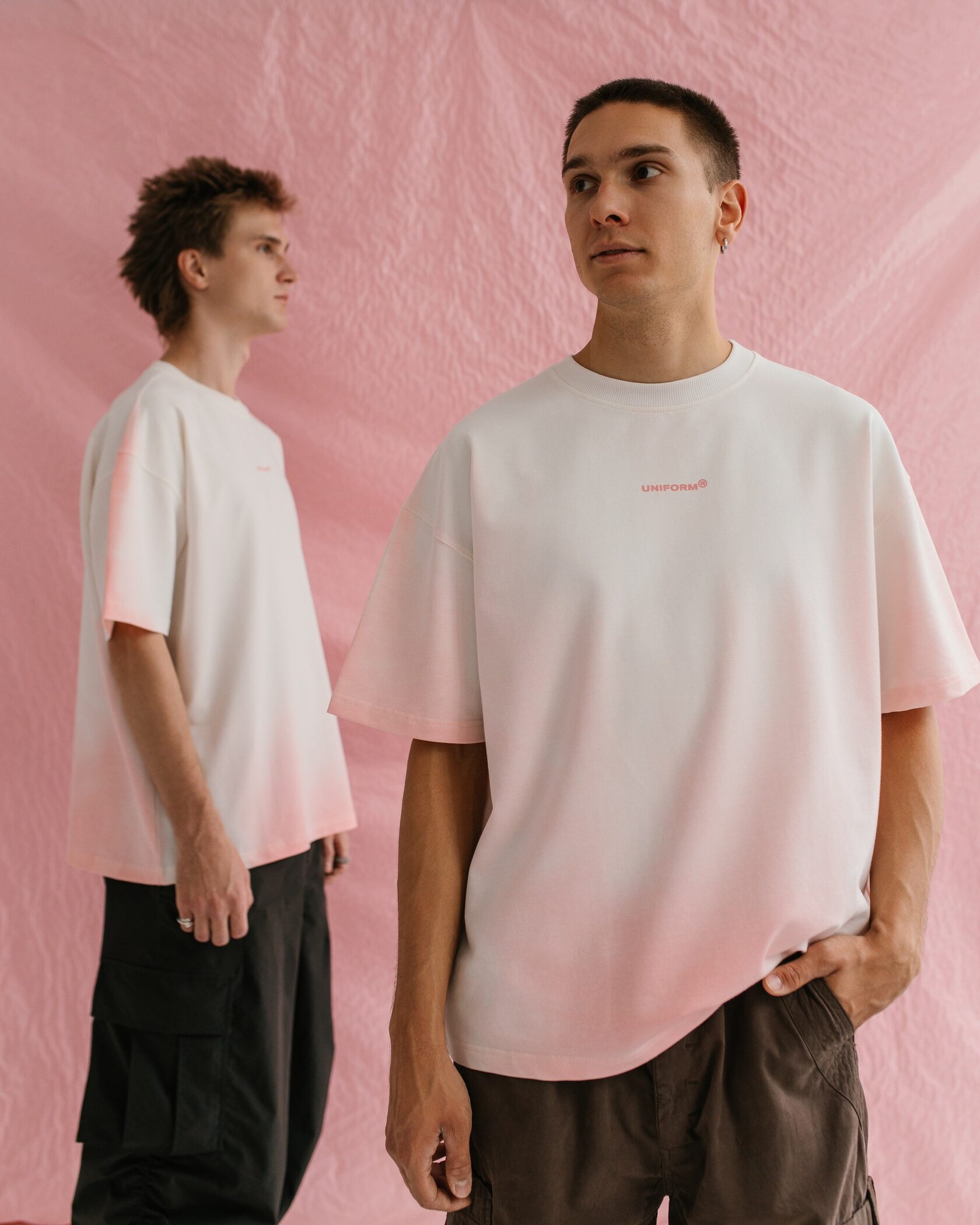 Термохромная ткань меняет цвет при температуре 31°, в холодном состоянии цвет изделия - розовый, в теплом состоянии цвет изделия - белый. На теле цвет изделия остается динамичным, так как в местах прилегания к телу футболка меняет цвет.