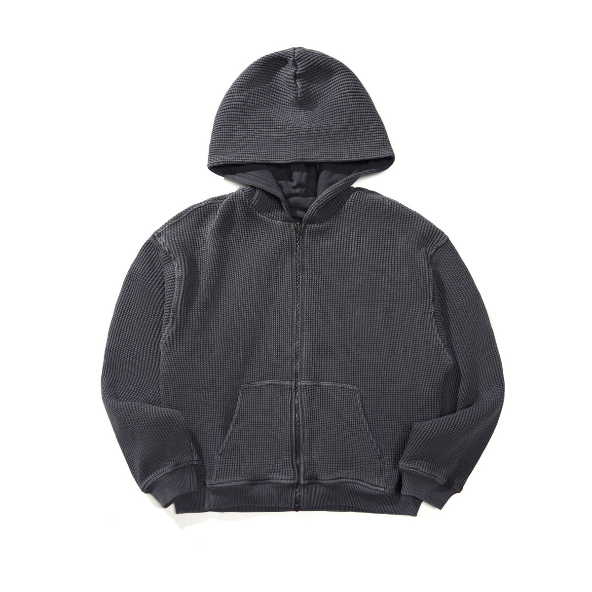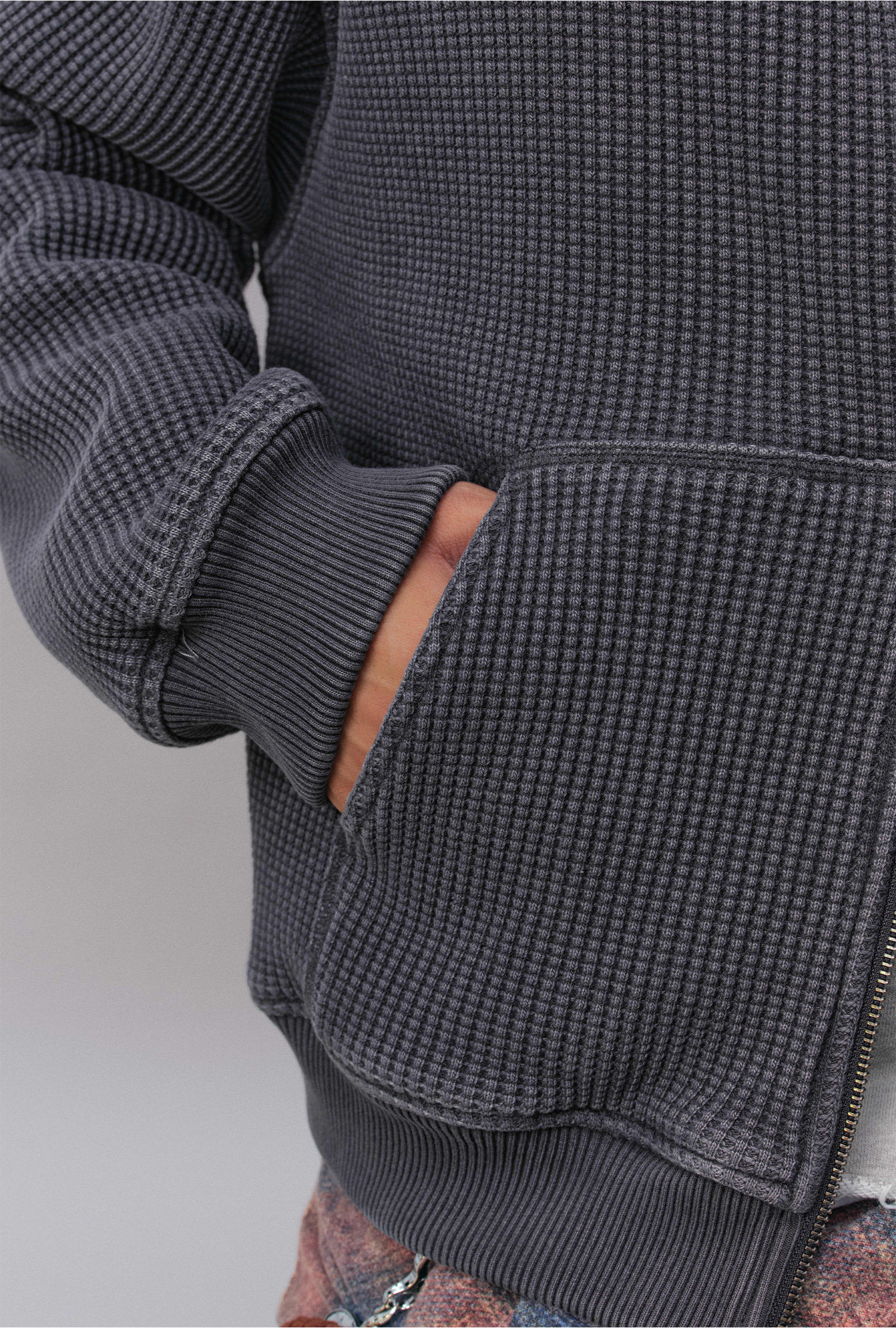 Внешняя сторона куртки выполнена из фактурной ткани с крупным, рельефным узором «вафля», что создает уникальную текстуру и модный, состаренный стиль.
