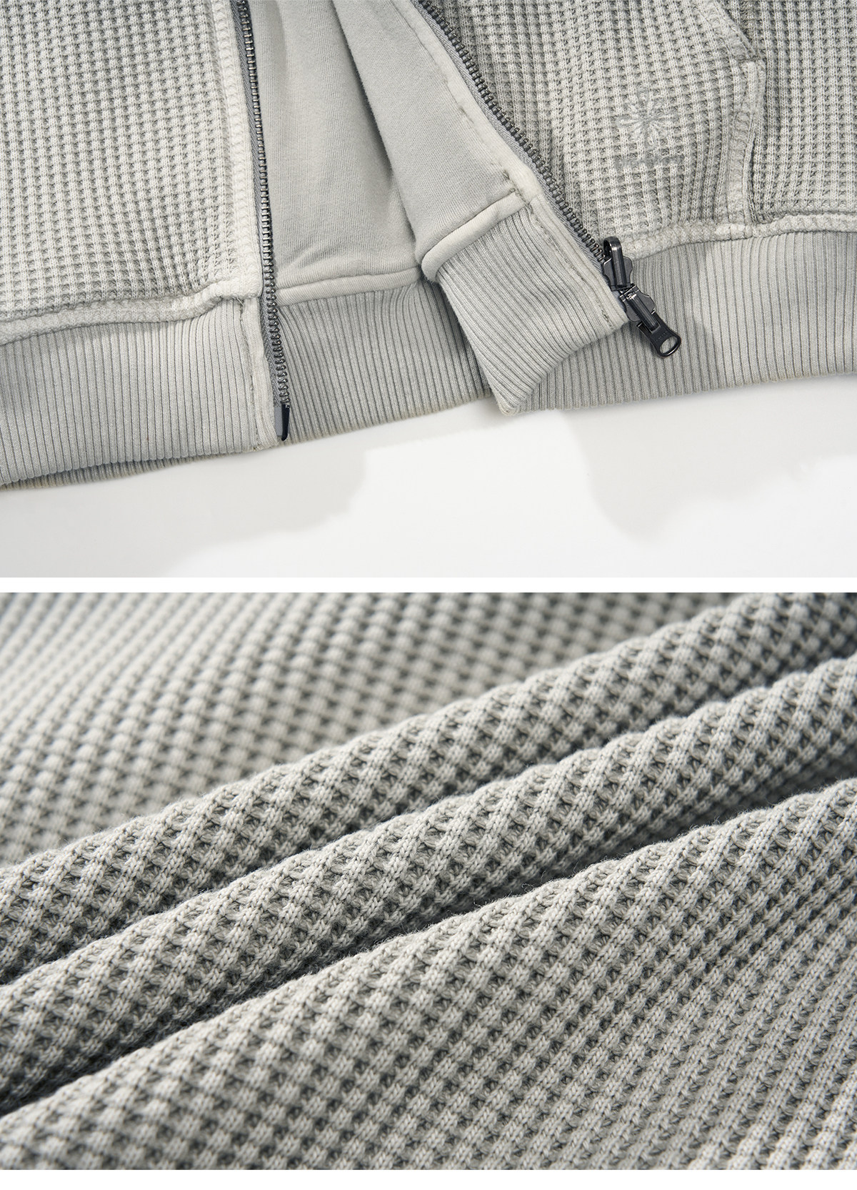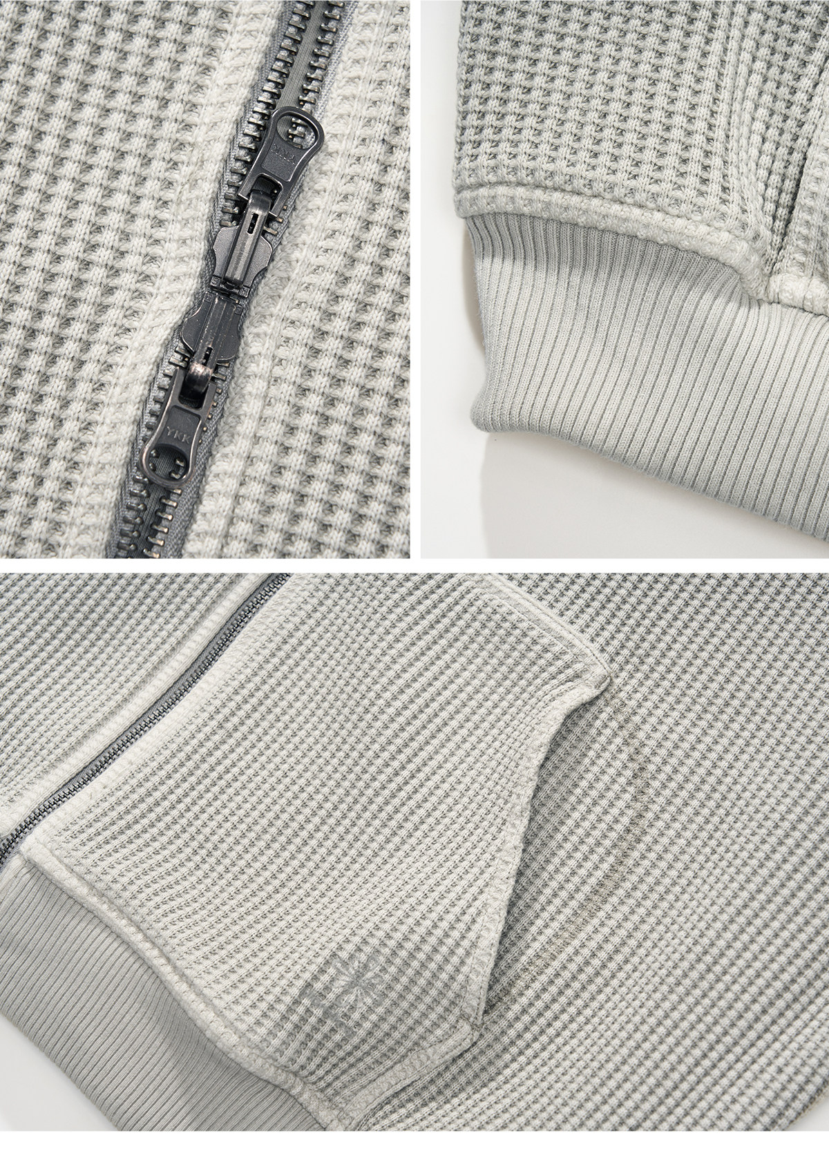 • Внешняя сторона куртки выполнена из фактурной ткани с крупным, рельефным узором «вафля», что создает уникальную текстуру и модный, состаренный стиль.