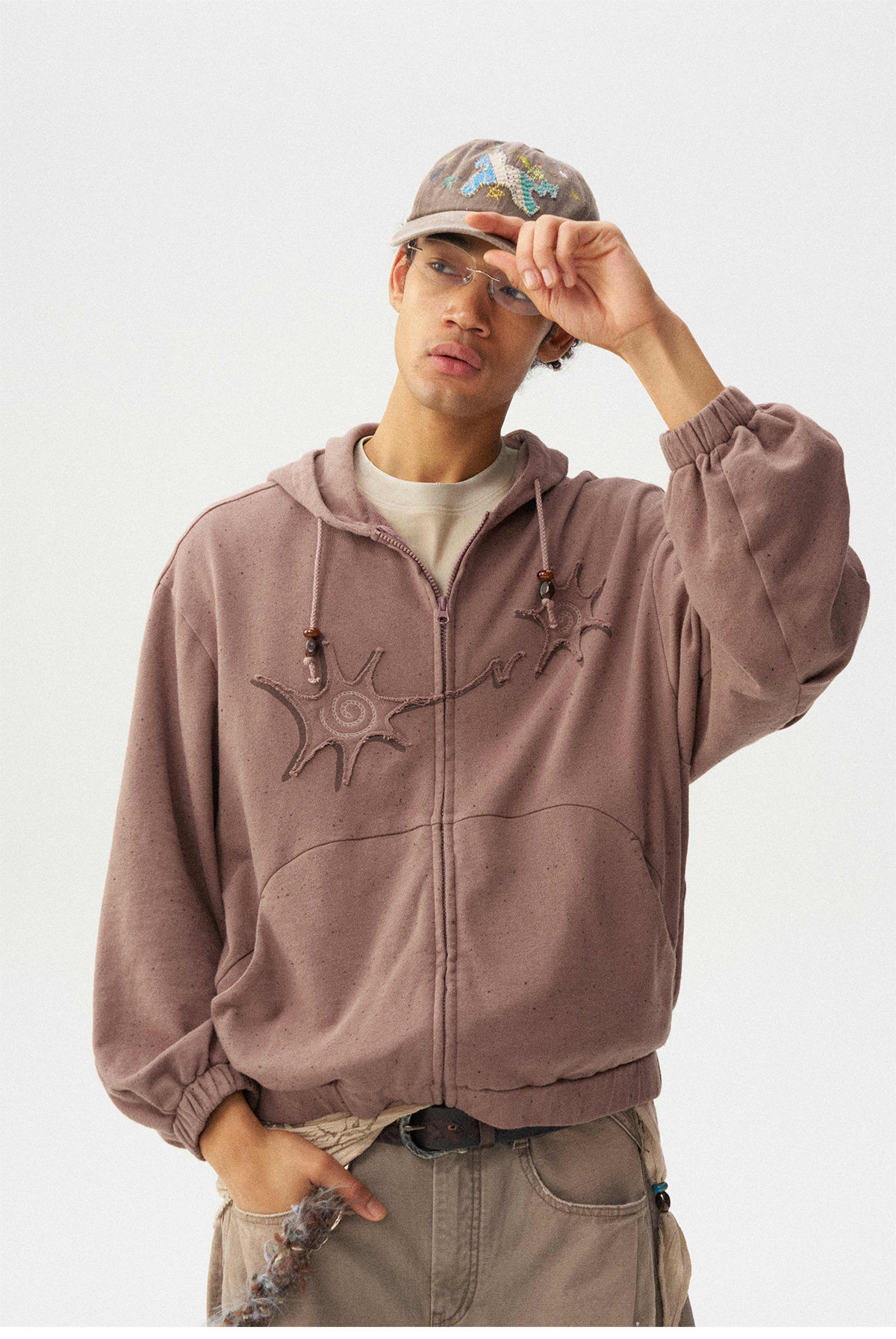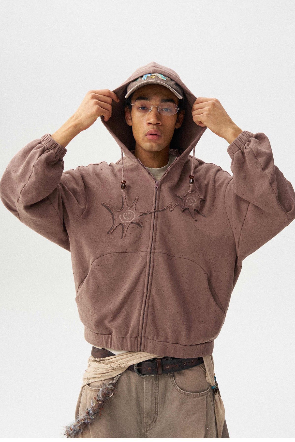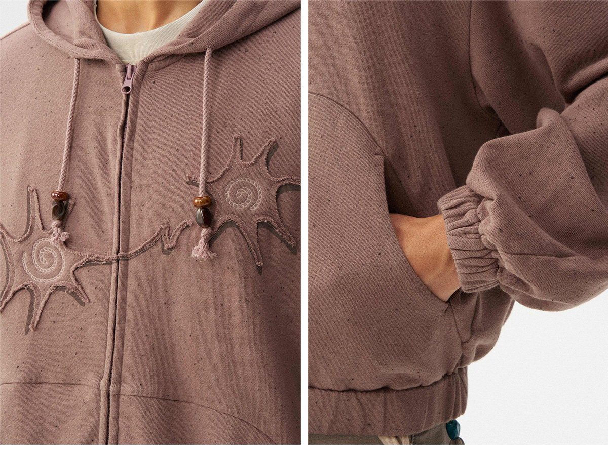 Сочетание множества техник: принта и вышивки. Концы шнурка на капюшоне украшены бусинами ручной работы. Свободный крой, рукав покроя «сабля» (изогнутый) обеспечивает комфорт и соответствует винтажному стилю.