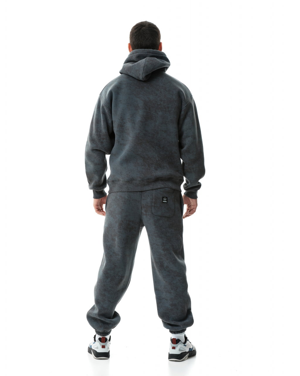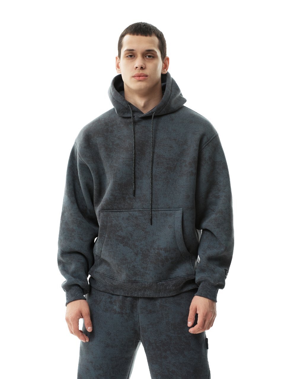 Оверсайз худи винтажного цвета, внешне напоминающего окраску камня обсидиан. Утяжка на капюшоне с рефлективным эффектом. Кенгуру карман. Фирменный логотип на рукаве изделия.