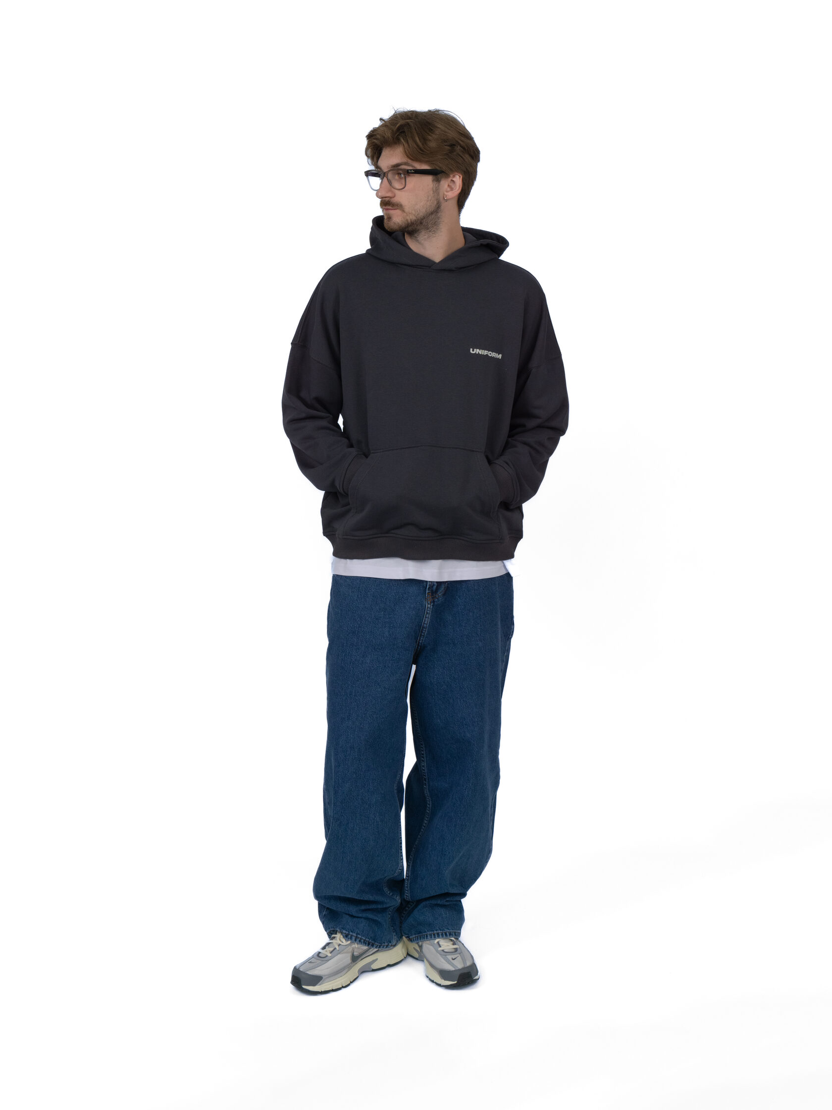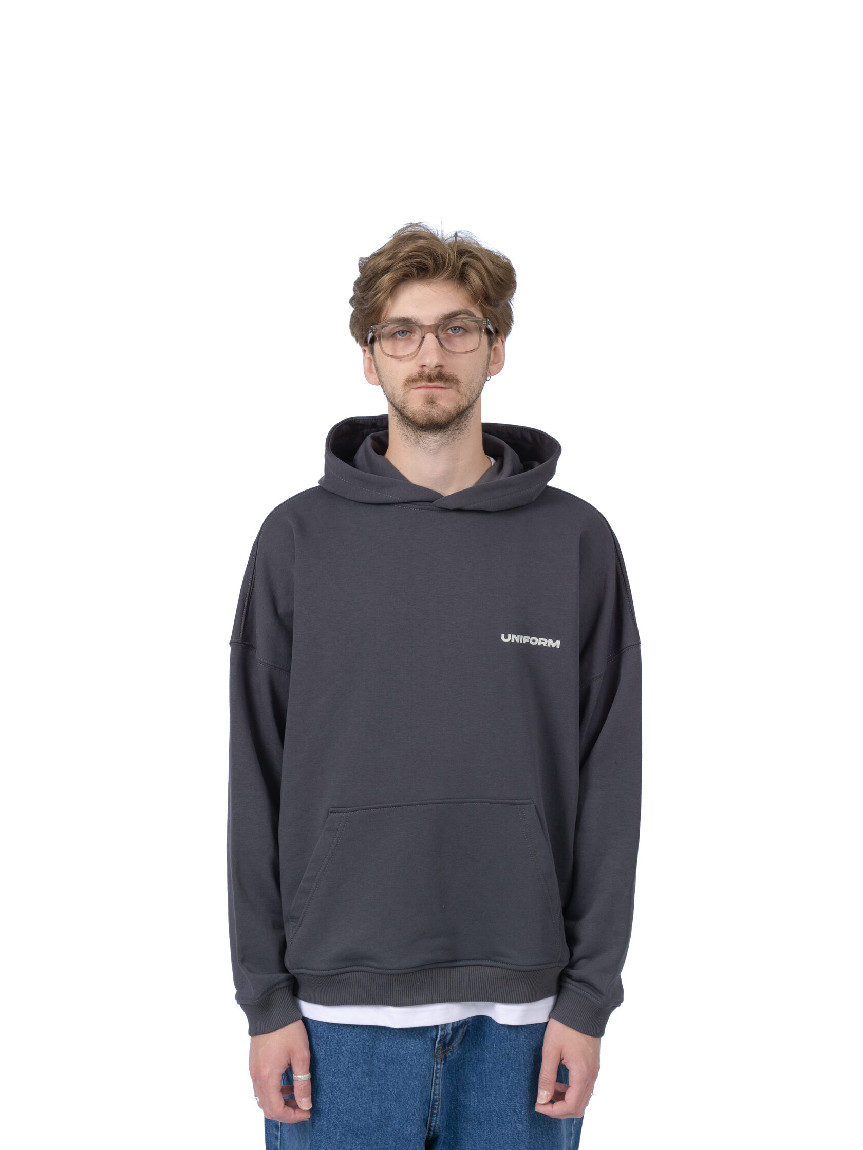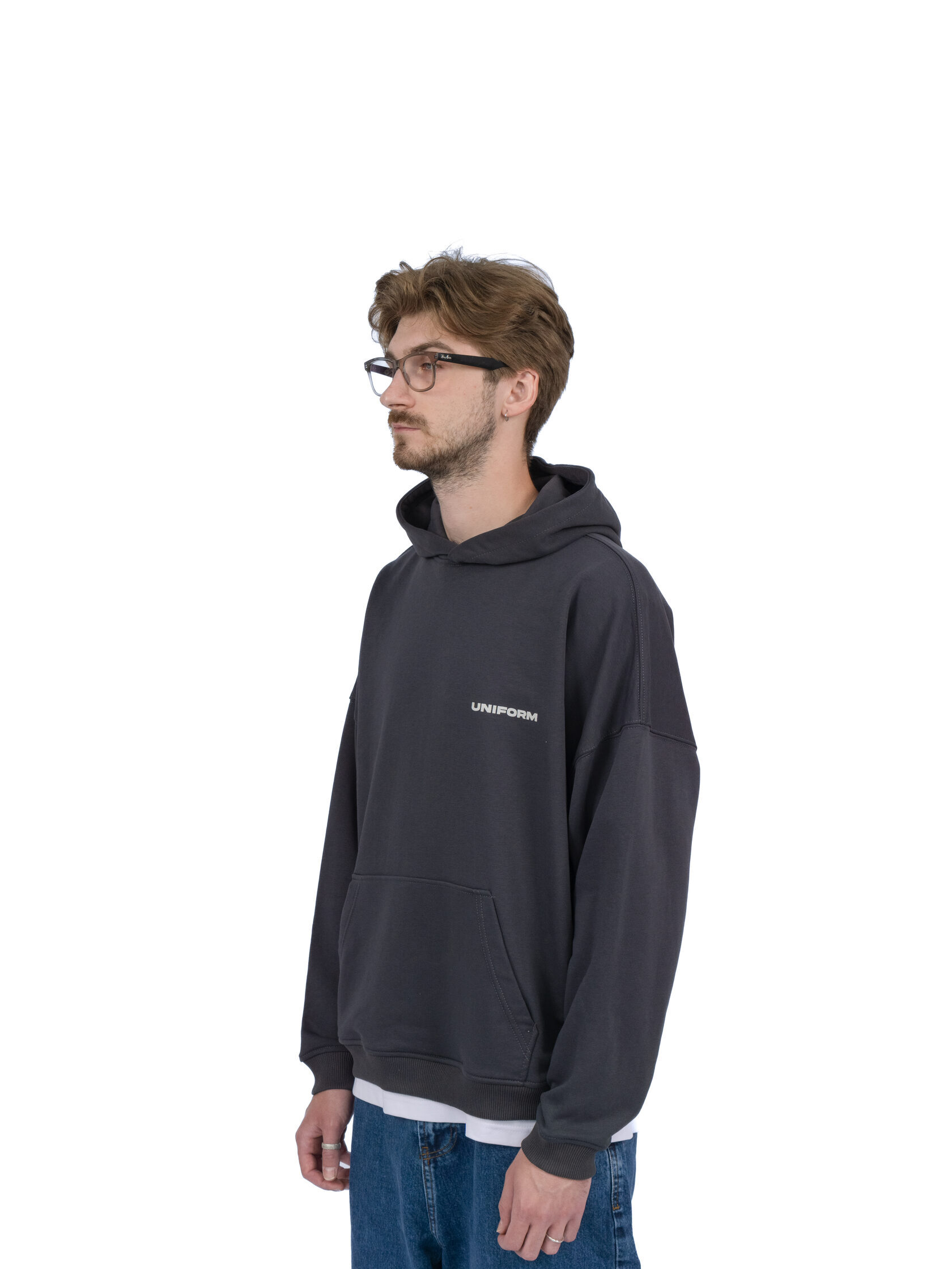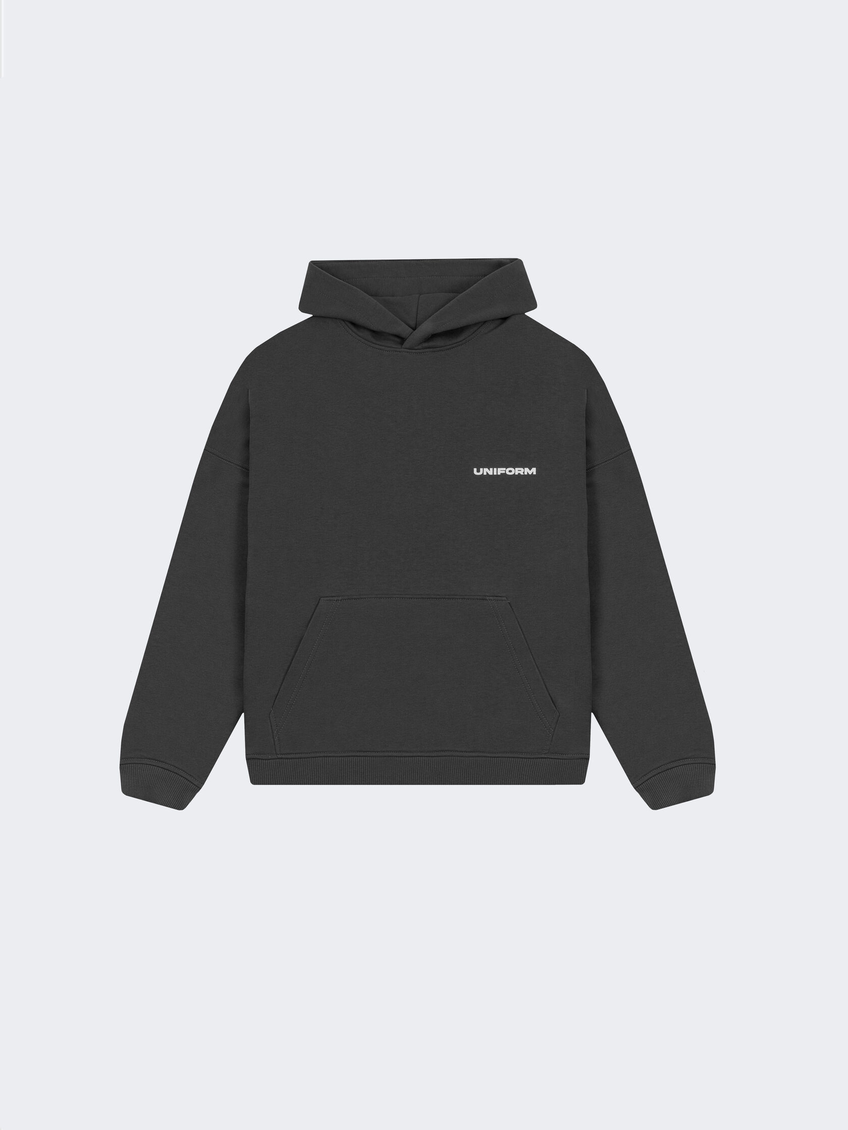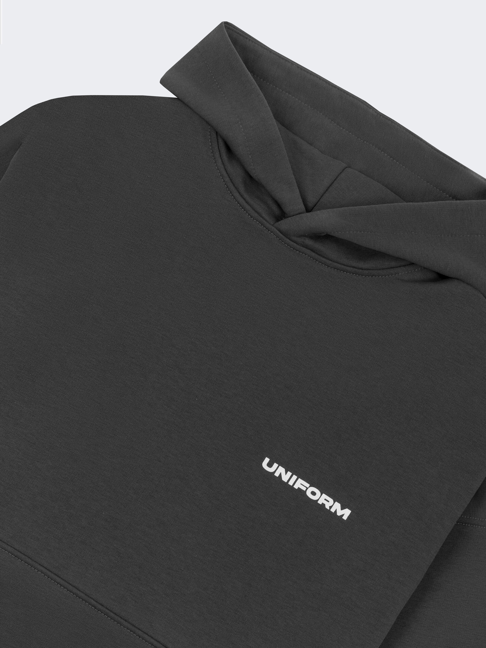 Оверсайз худи насыщенного серого цвета, из петельчатого футера и велюровым эффектом. Модель обеспечивает максимальный комфорт благодаря капюшону без шнурка, практичному карману и манжетам на рукавах и снизу изделия. Укороченный и более широкий силуэт идеален для создания стильных уличных образов.