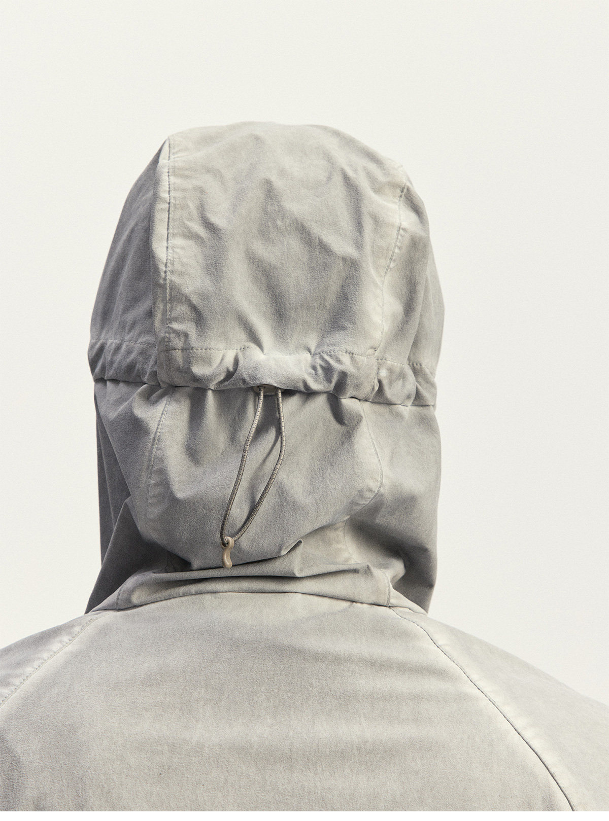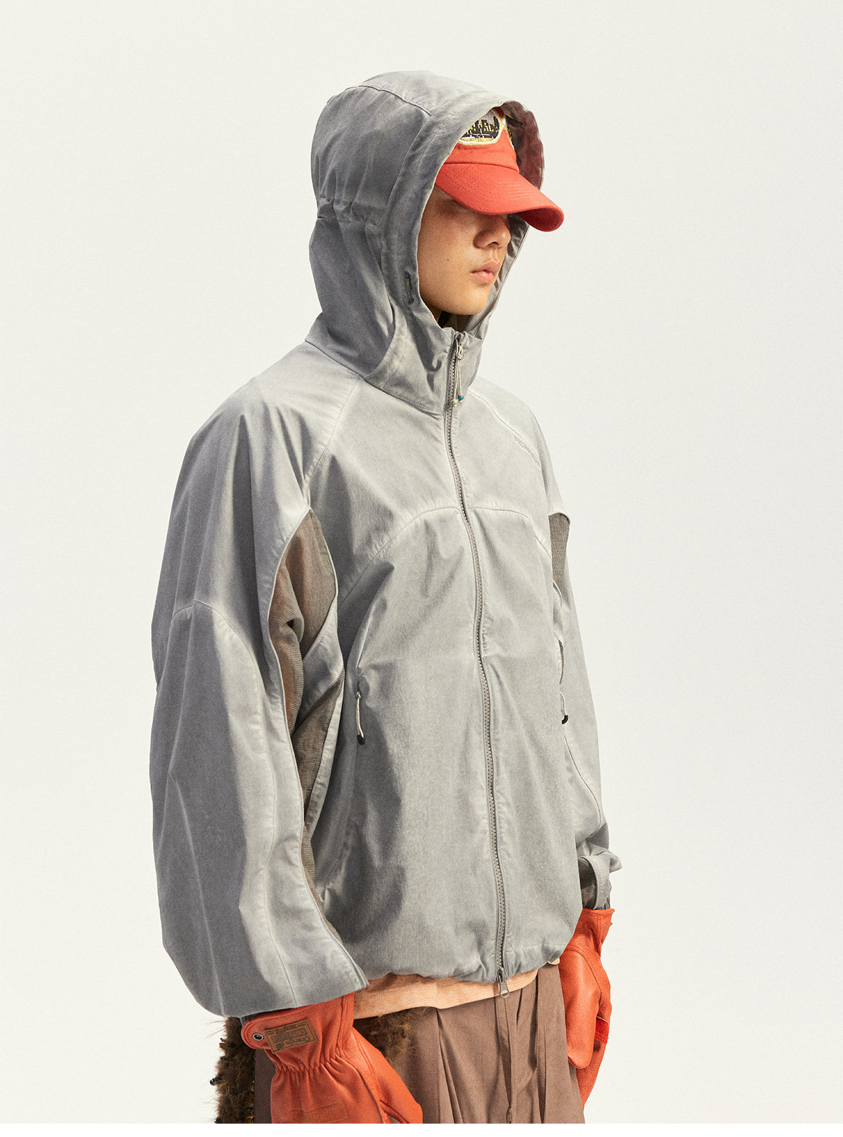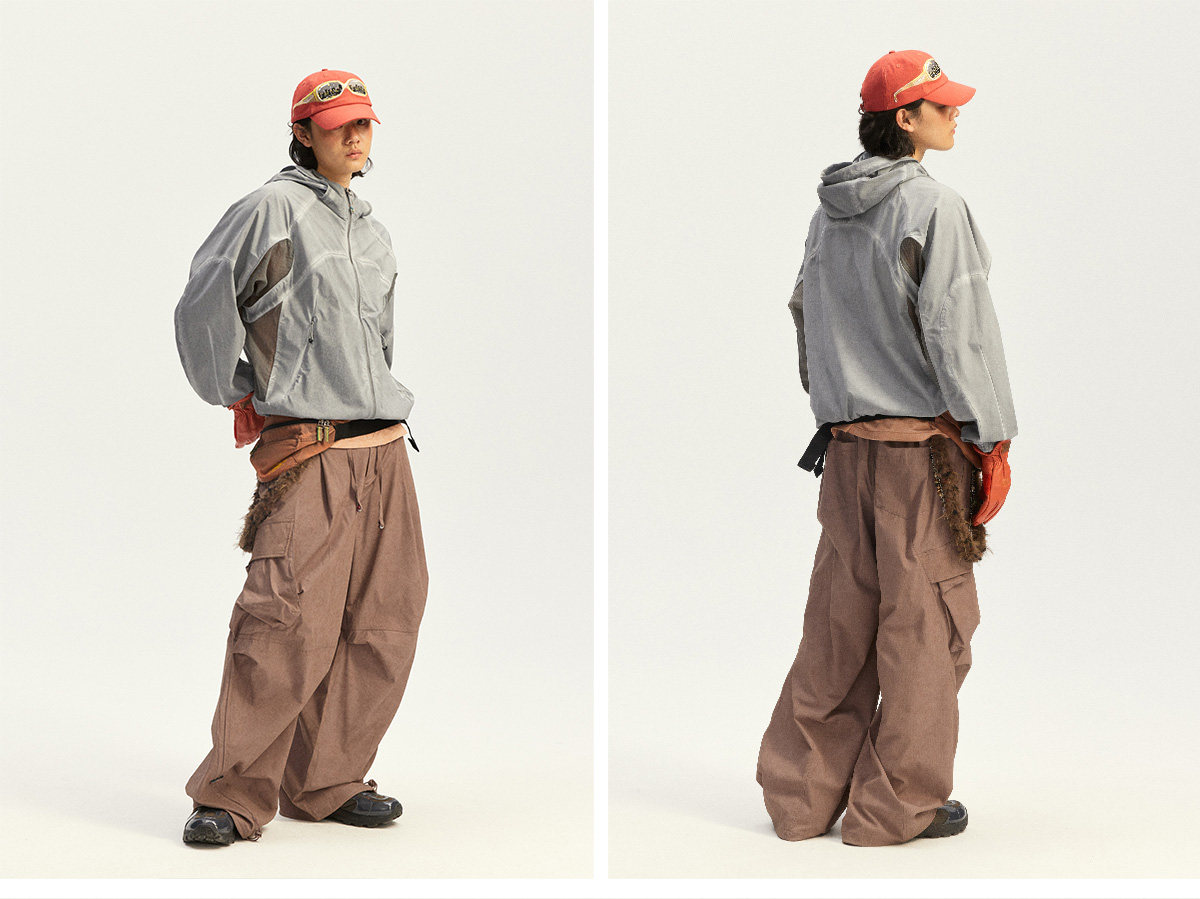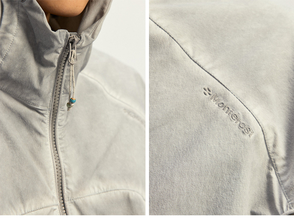 Используется высокоэластичная ткань «четырехсторонний стрейч» из 70D крученого нейлона. Благодаря наложению трех технологий водной обработки: двойное окрашивание, грязная стирка и эффект потертости (обнажение основы) — достигается естественный эффект состаренной поверхности.