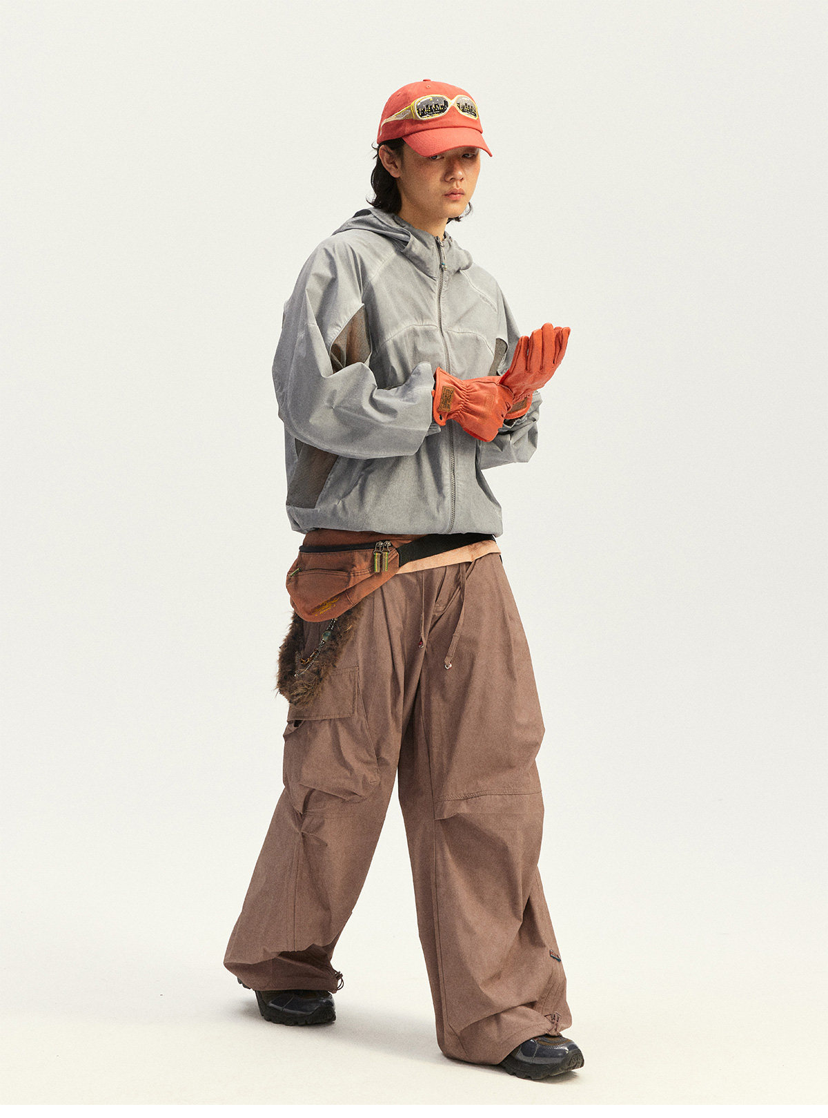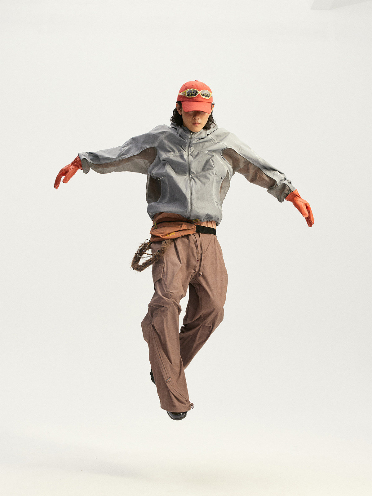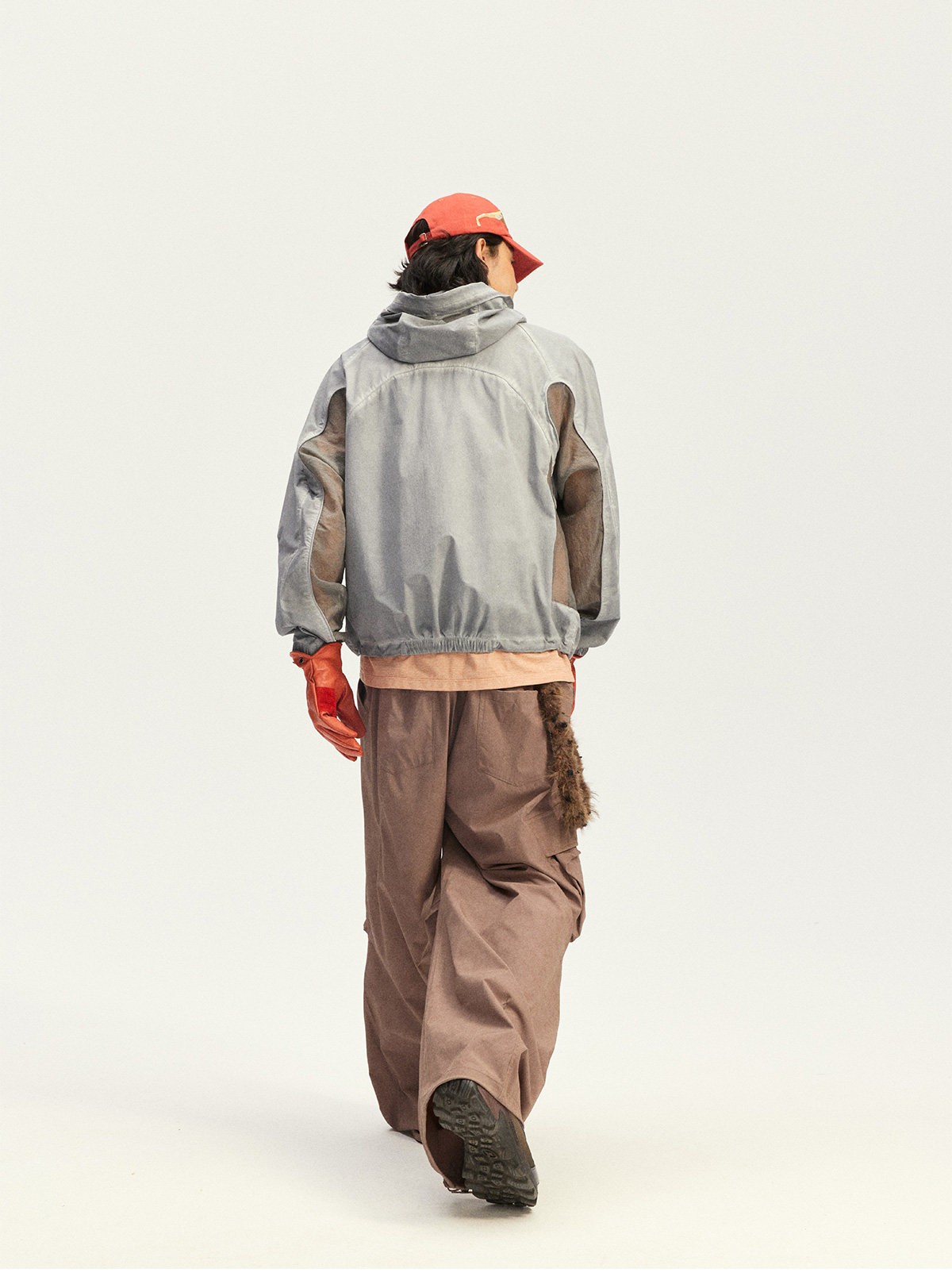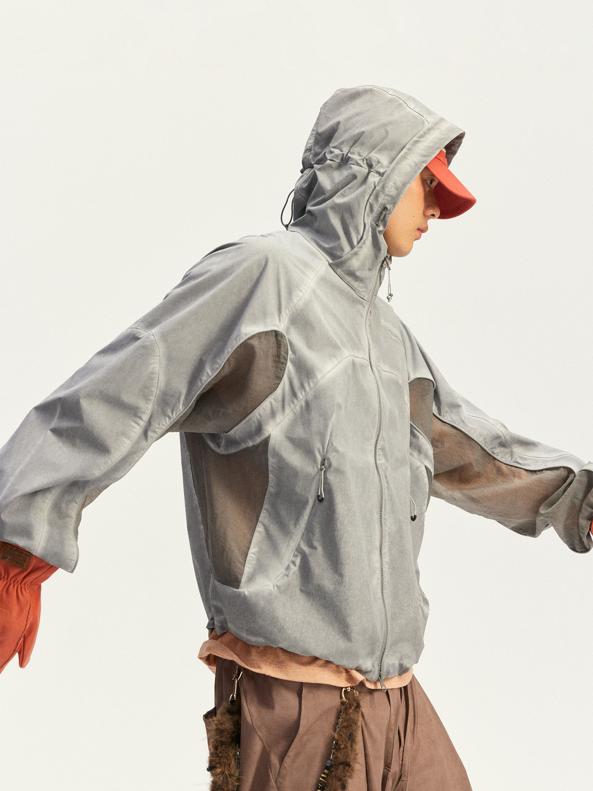 Используется высокоэластичная ткань «четырехсторонний стрейч» из 70D крученого нейлона. Благодаря наложению трех технологий водной обработки: двойное окрашивание, грязная стирка и эффект потертости (обнажение основы) — достигается естественный эффект состаренной поверхности.