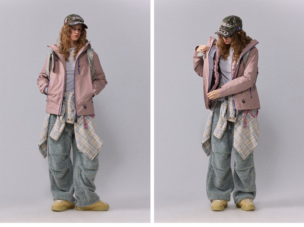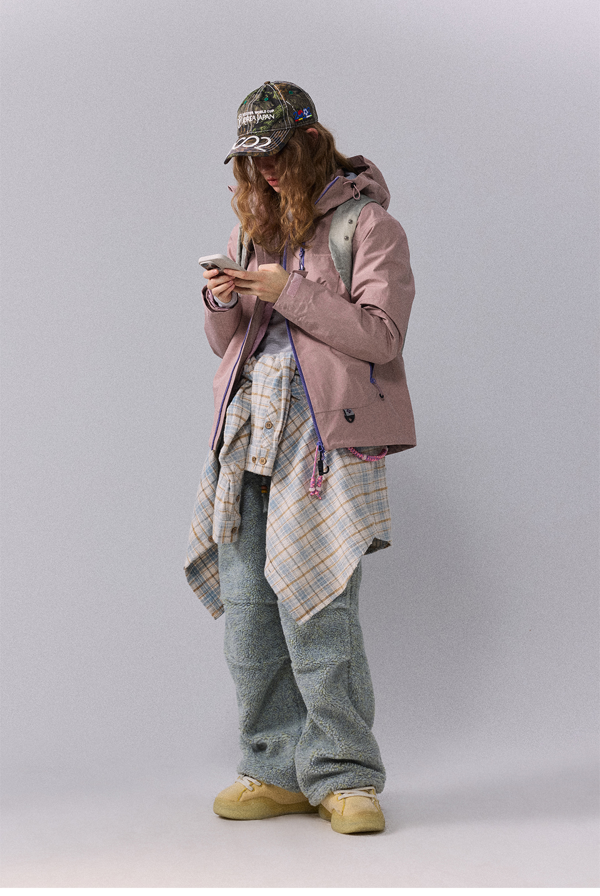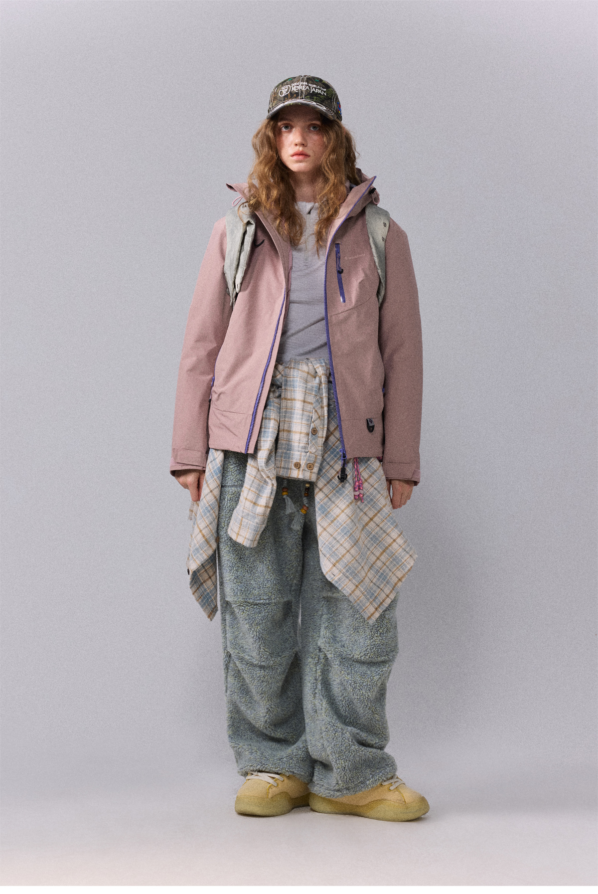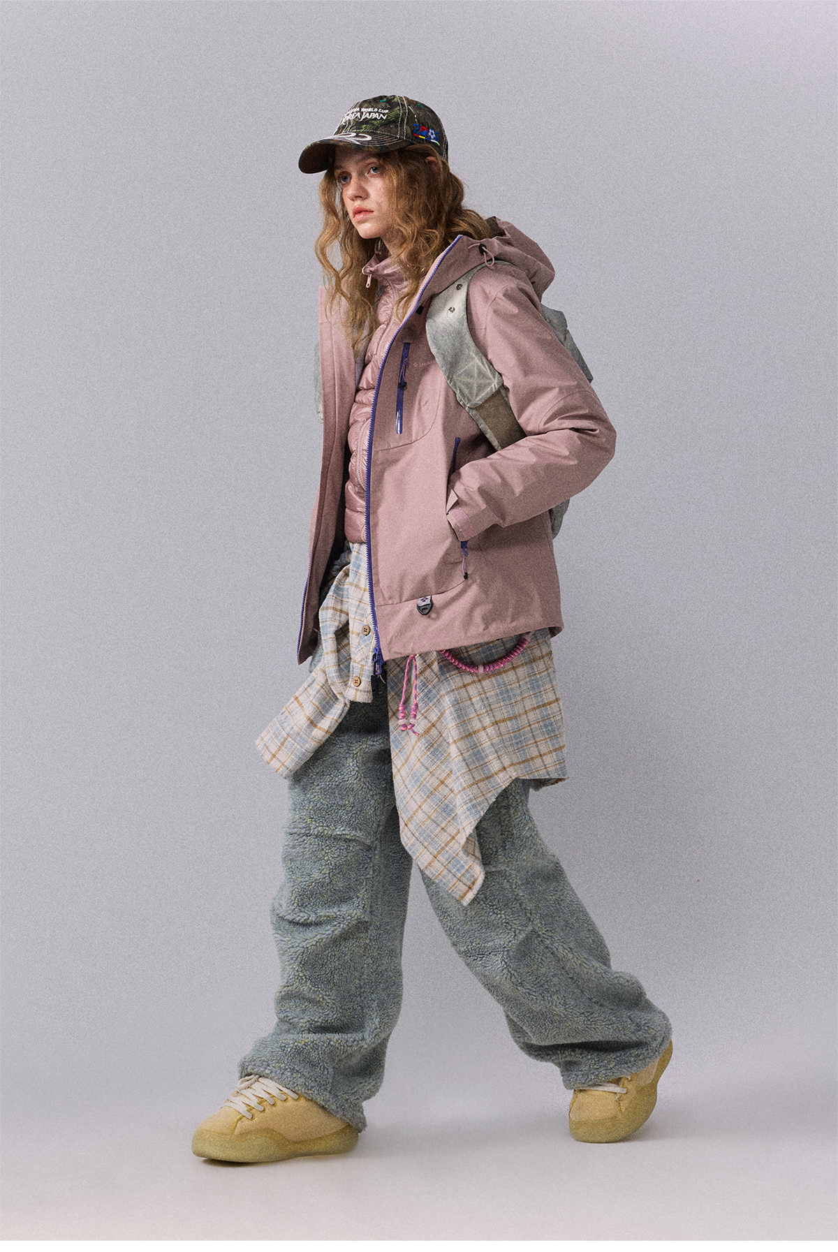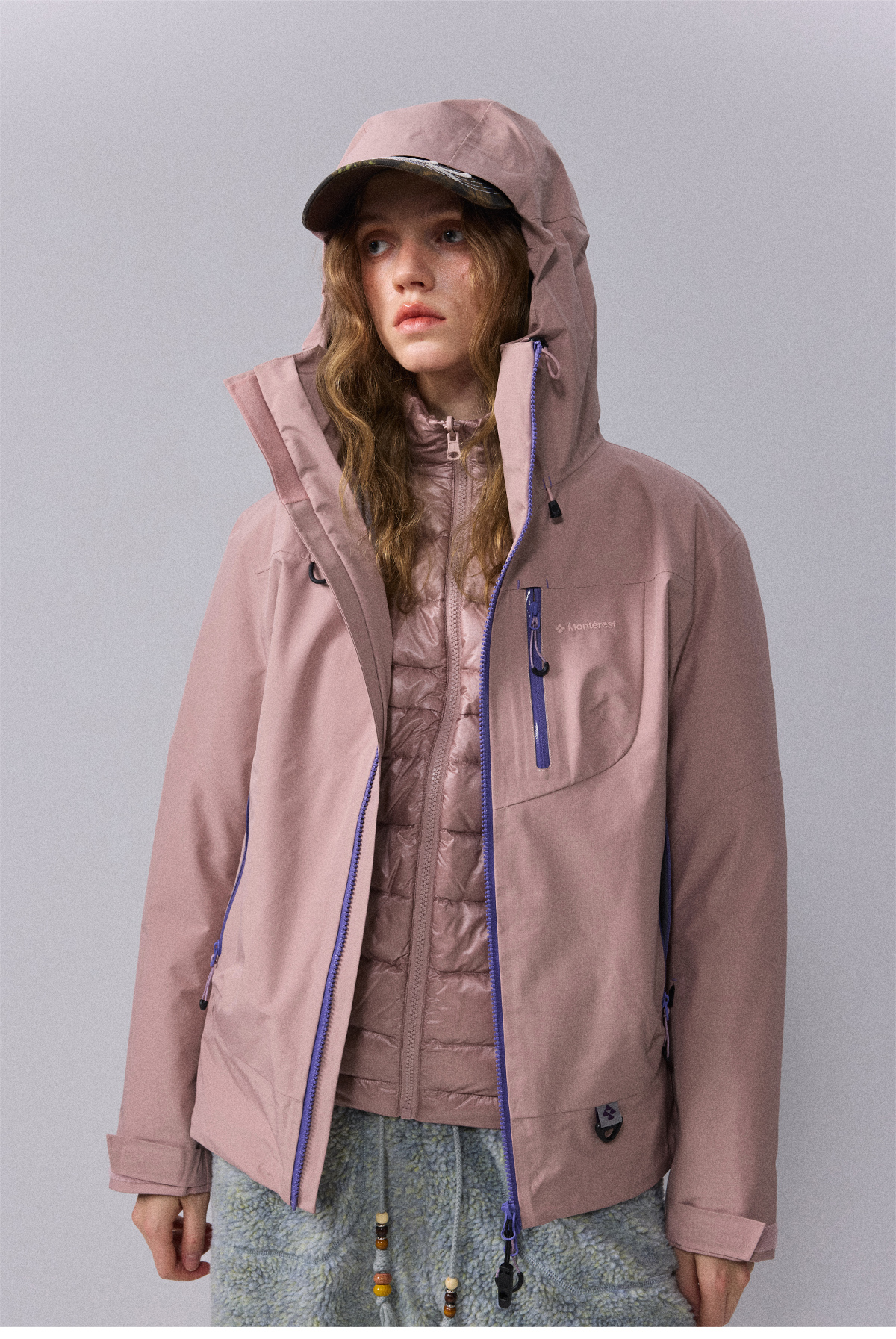 Внешняя ткань с водонепроницаемостью 20K/10K (водный напор 20 000 мм, паропроницаемость 10 000 г/м²/24 ч). Лёгкая и прочная, обеспечивает отличную защиту от непогоды. Внутренний слой — тёплый пуховик для зимы.