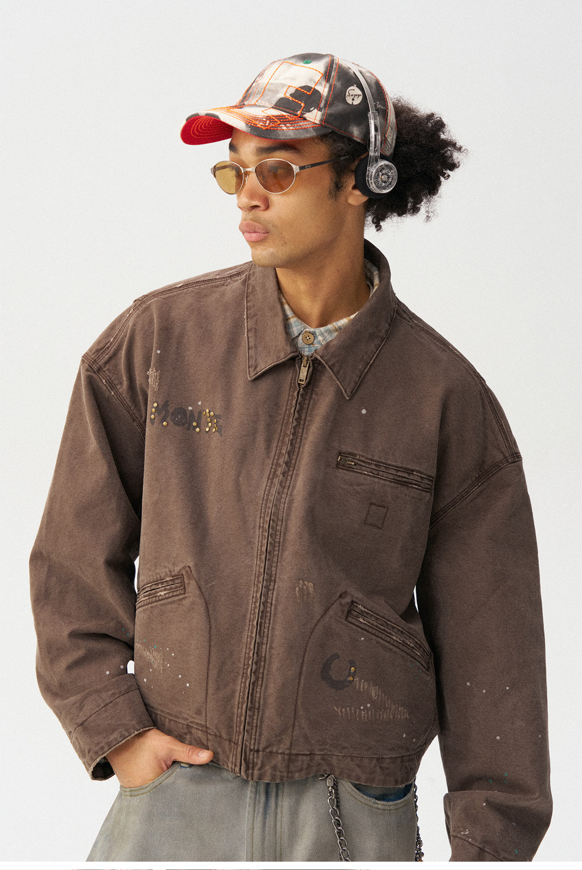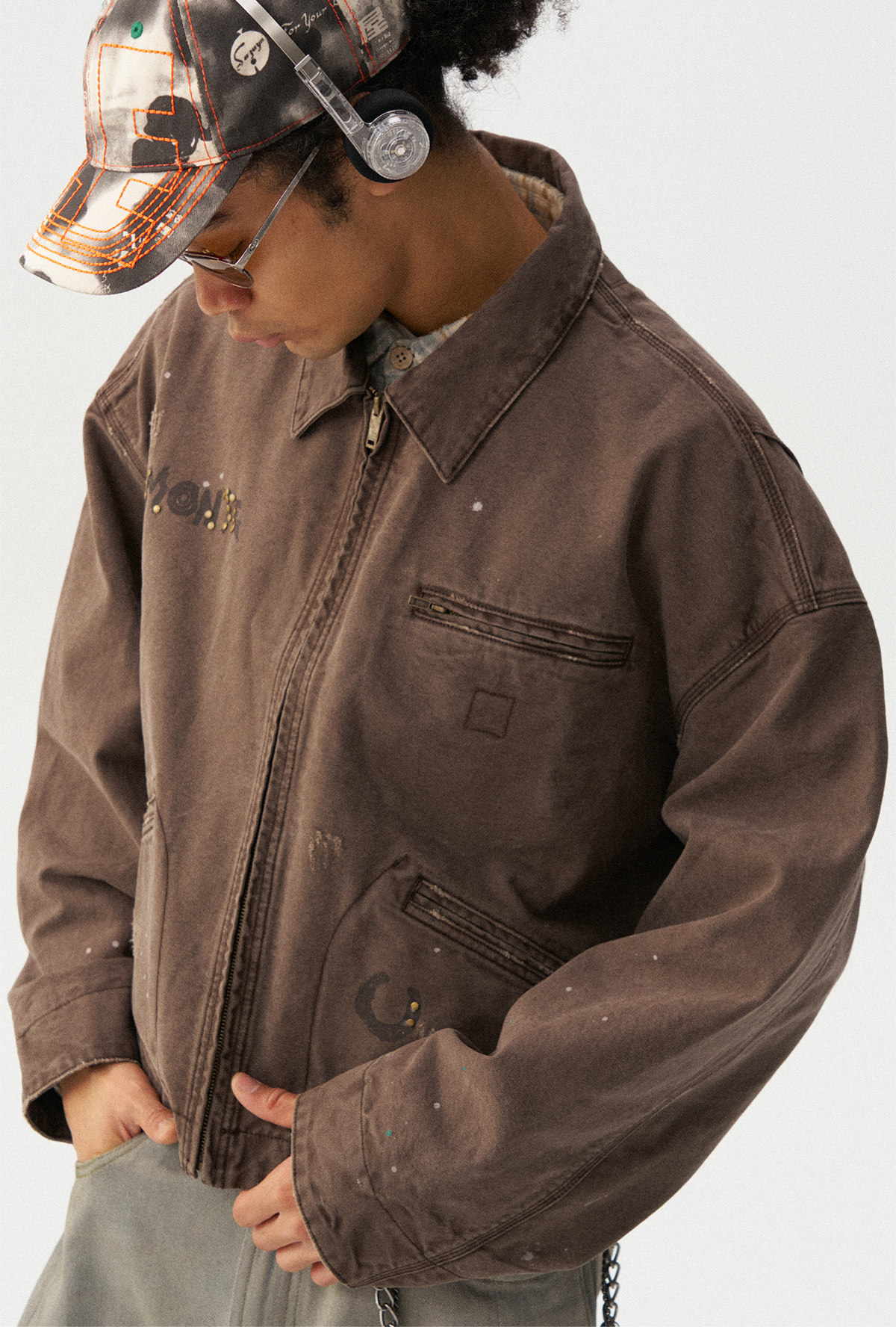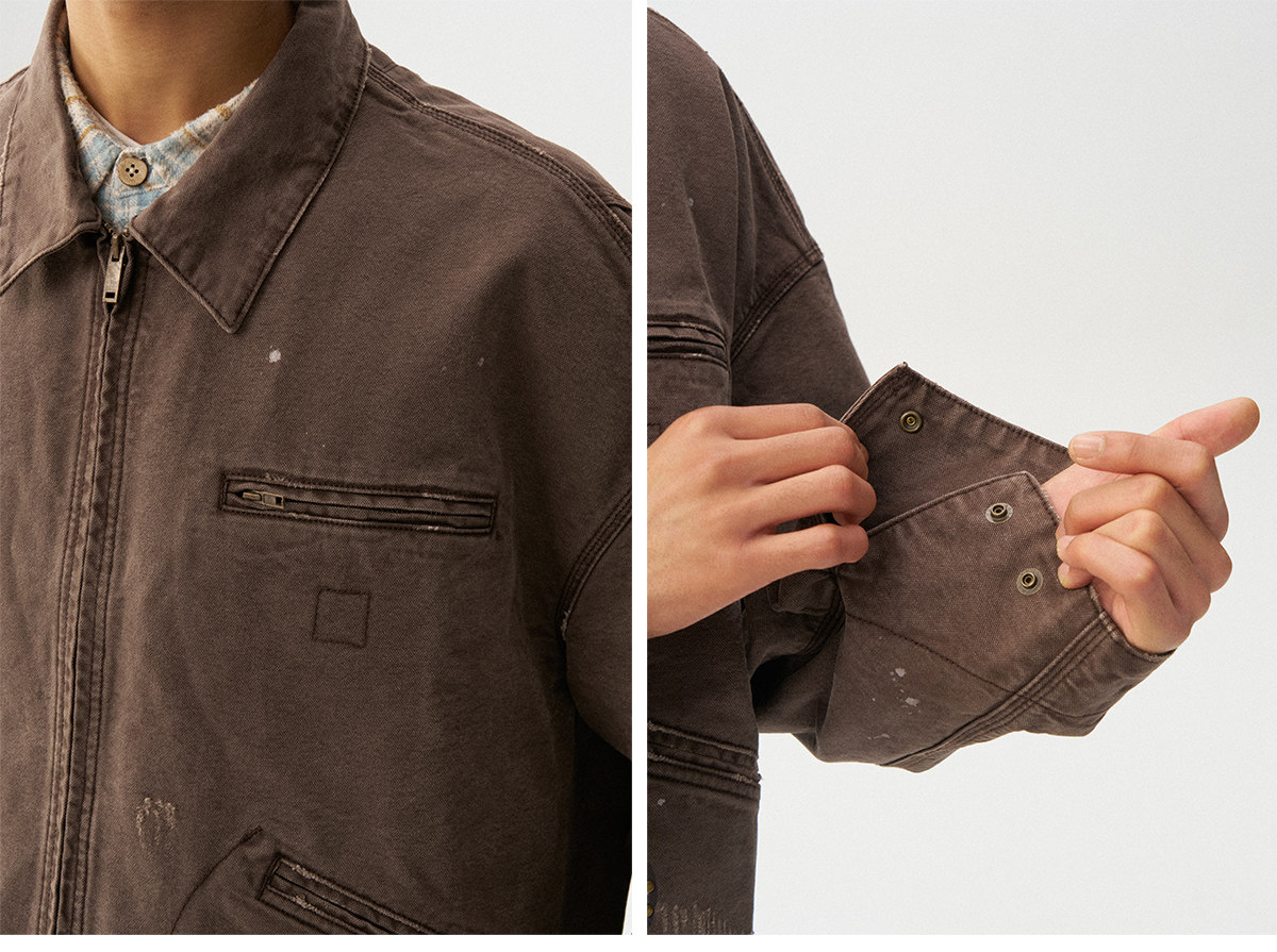 Технология открытых швов в сочетании с винтажными заклепками, балансирующая между грубоватостью и изысканностью. Уникальный выцветший винтажный оттенок, дополненный свободным краплением (техника нанесения краски брызгами), позволяет легко создать молодёжный, непосредственный образ в стиле стритвир.