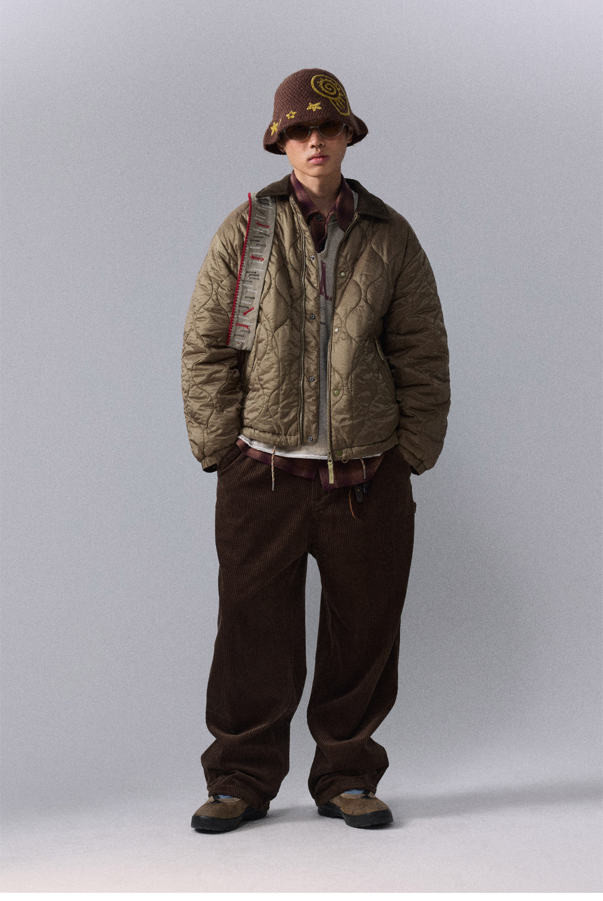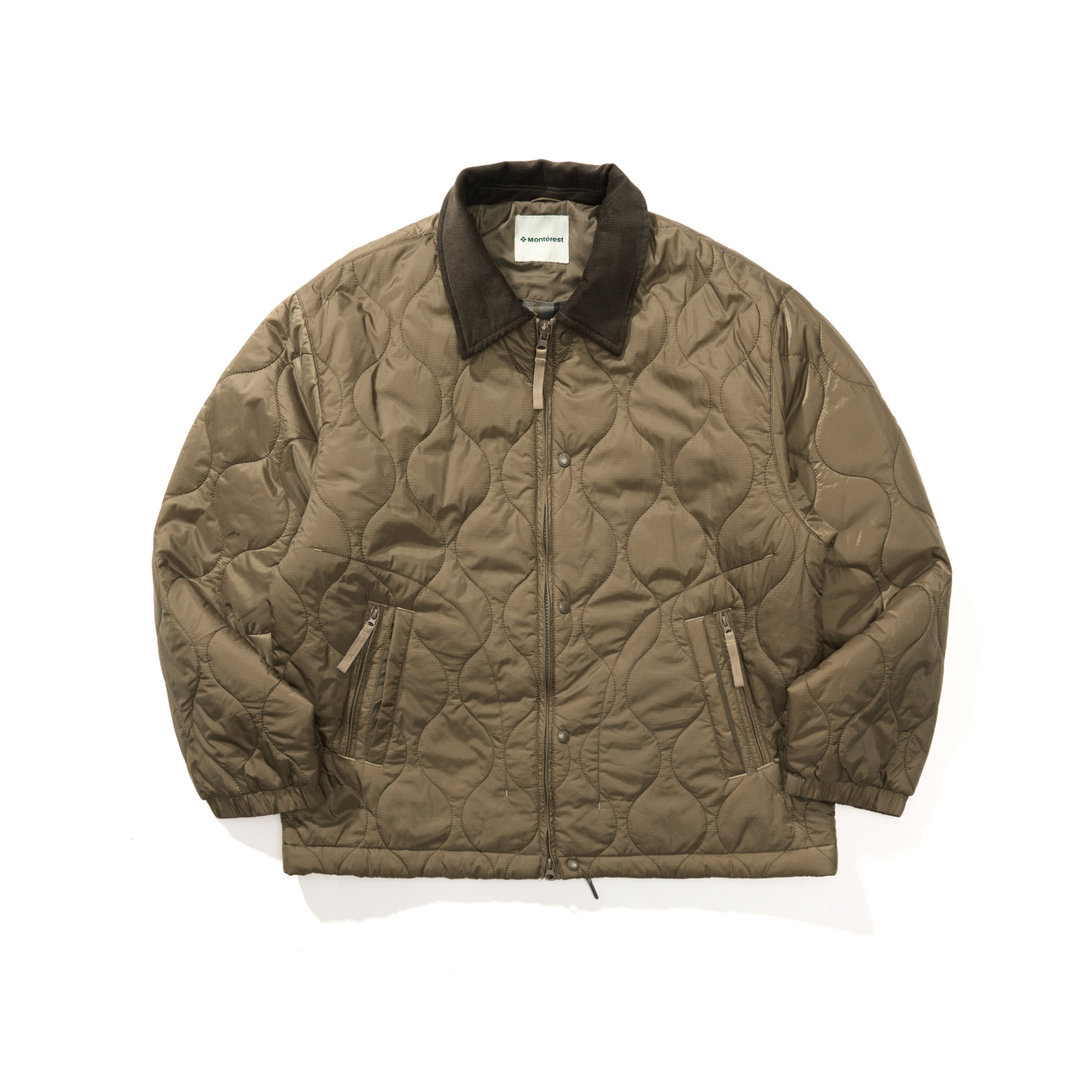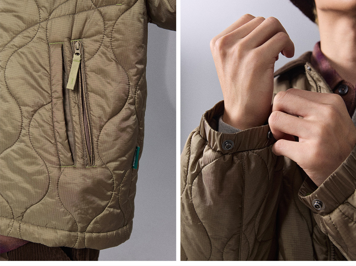Воротник из вельвета с эффектом "варенки" (состаренного) выполнен из материала с вертикальным рубчиком, обладающего сильной текстурой. На ощупь он теплый и мягкий, создавая интересное текстурное сочетание с более жесткой и структурированной стеганой тканью.