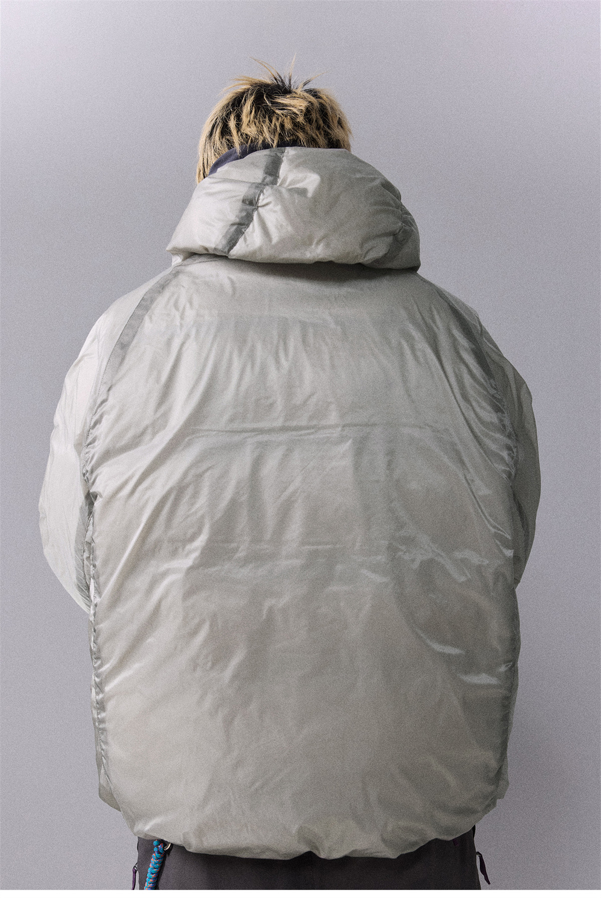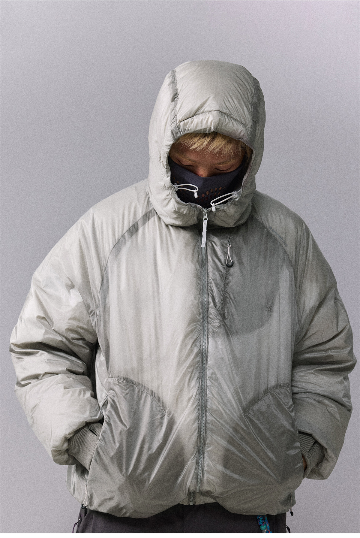 Прозрачная структурная конструкция разрушает тяжеловесное восприятие традиционной пуховой одежды.
