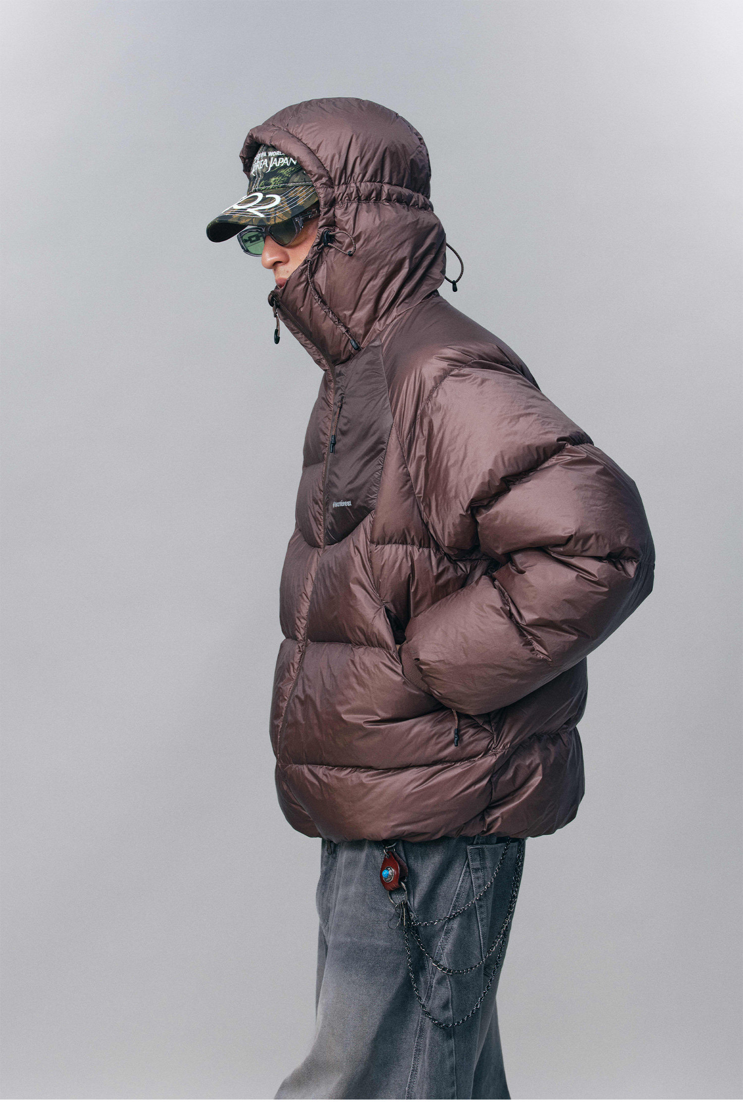 Модель сохраняет фирменный стиль бренда — свободный и комфортный крой. Используется лёгкий пуховый материал с глянцевой текстурой, а внутренняя сторона обработана анти-пуховым покрытием. В сочетании с подкладкой из ткани 380T это эффективно предотвращает выбивание пуха.