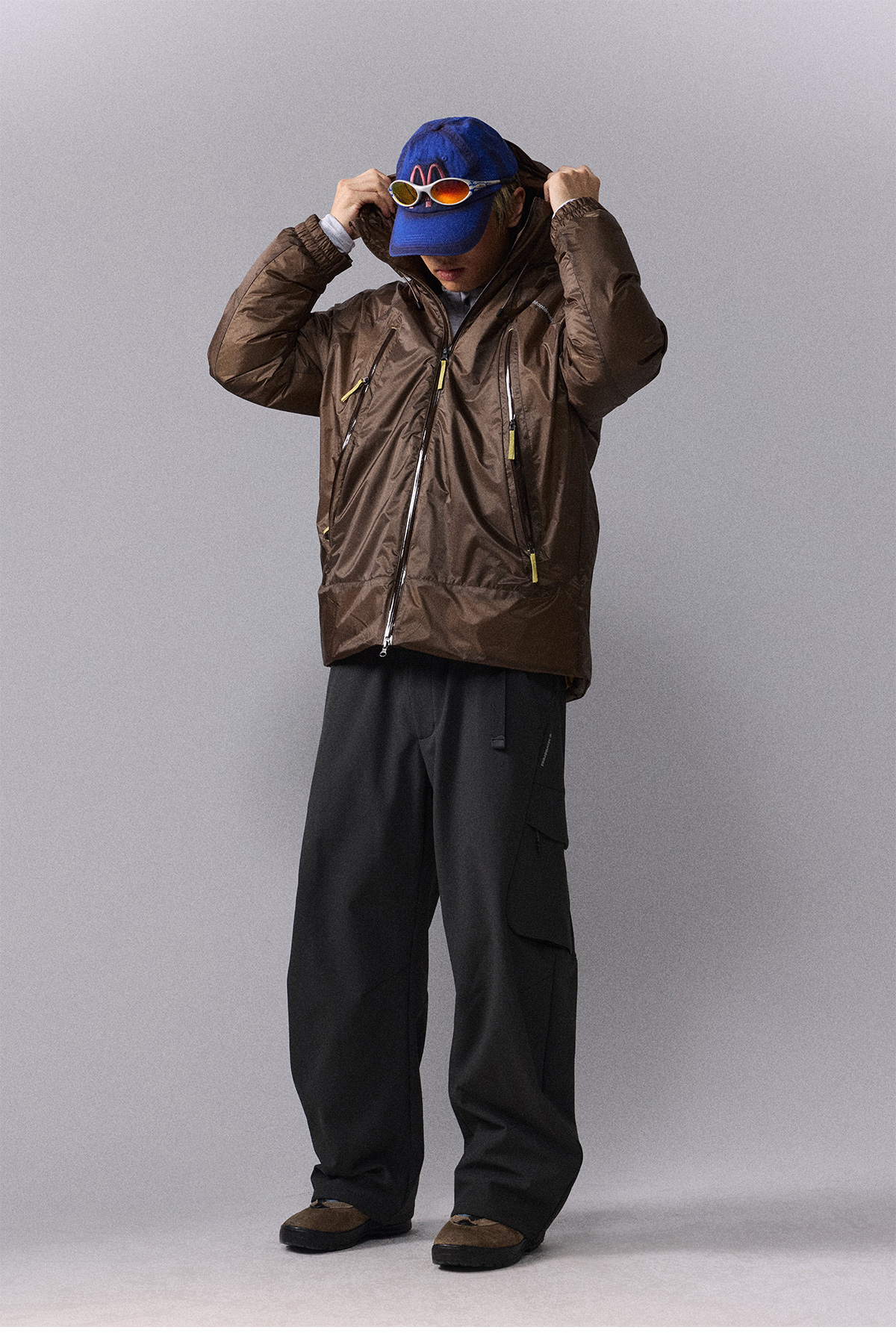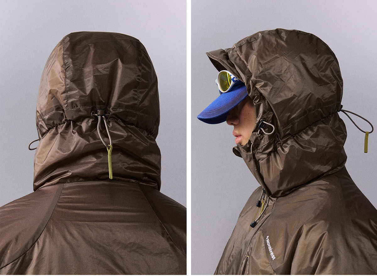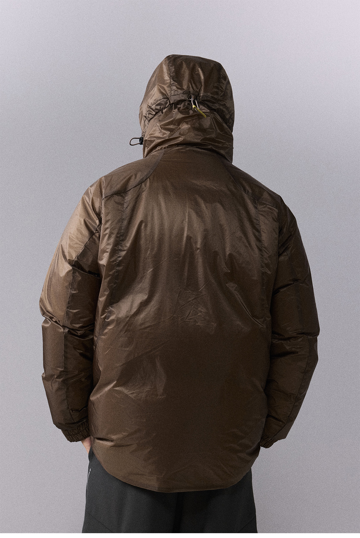 Ткань уровня outdoor shell для переменчивой погоды; двухслойная конструкция улучшает защиту от выхода пуха и комфорт при носке.
