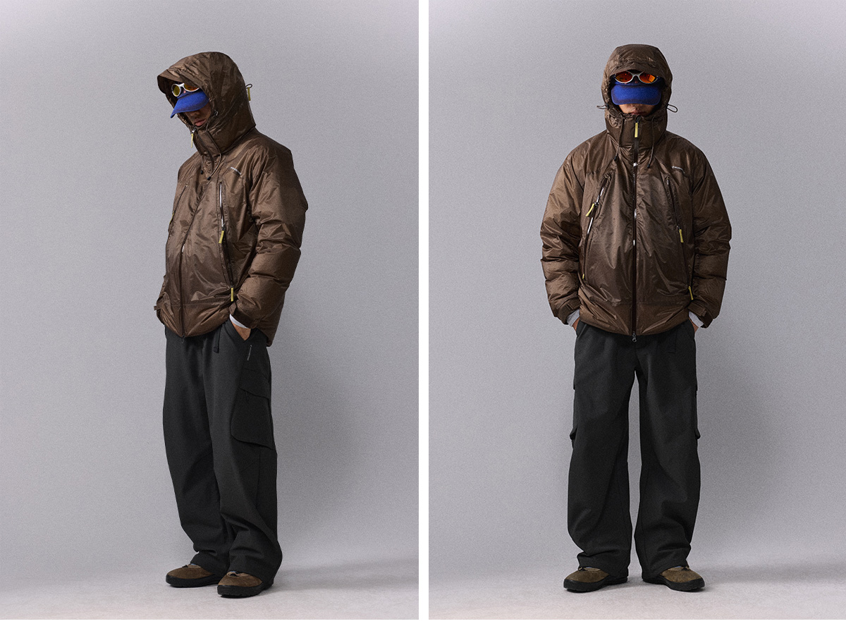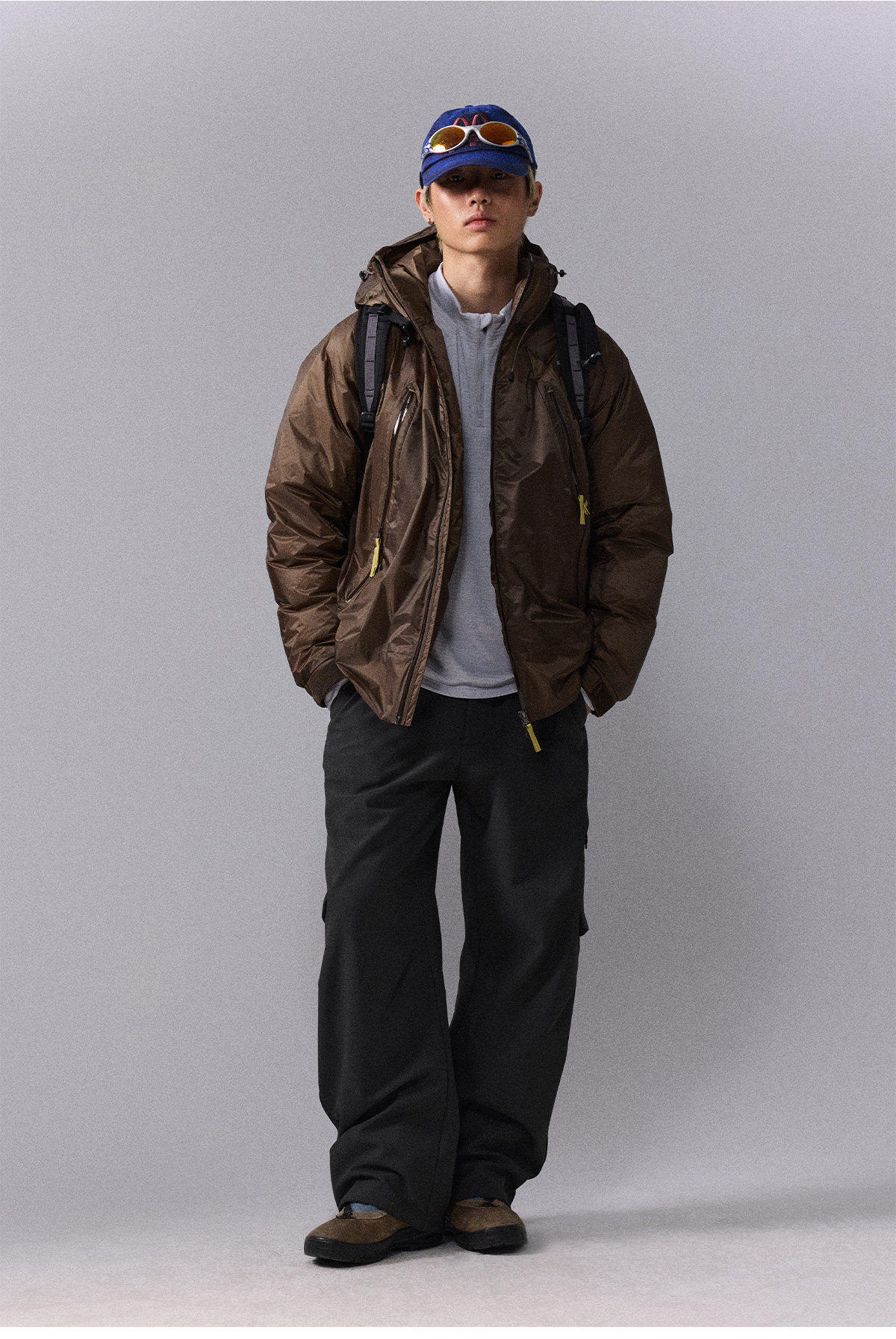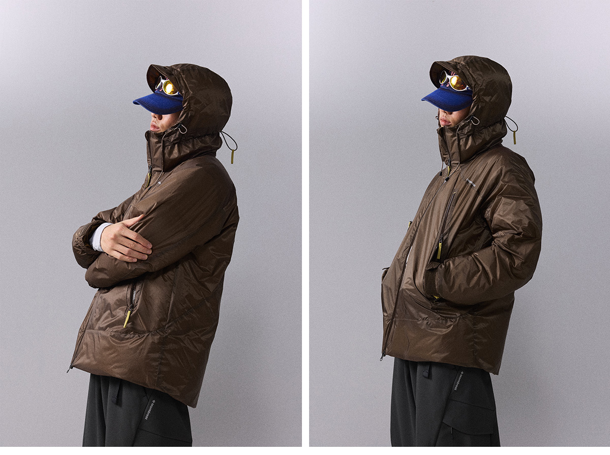 Ткань уровня outdoor shell для переменчивой погоды; двухслойная конструкция улучшает защиту от выхода пуха и комфорт при носке.