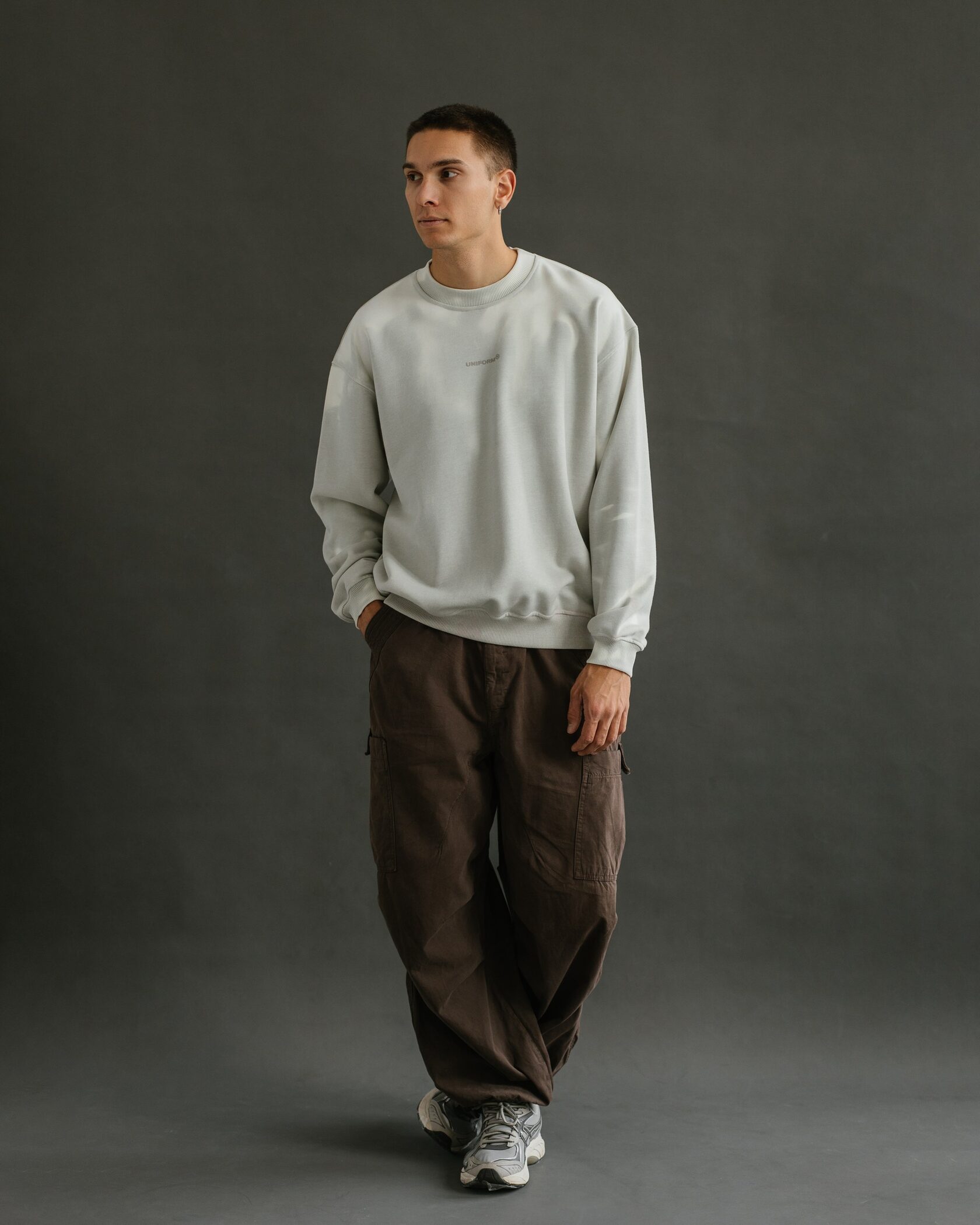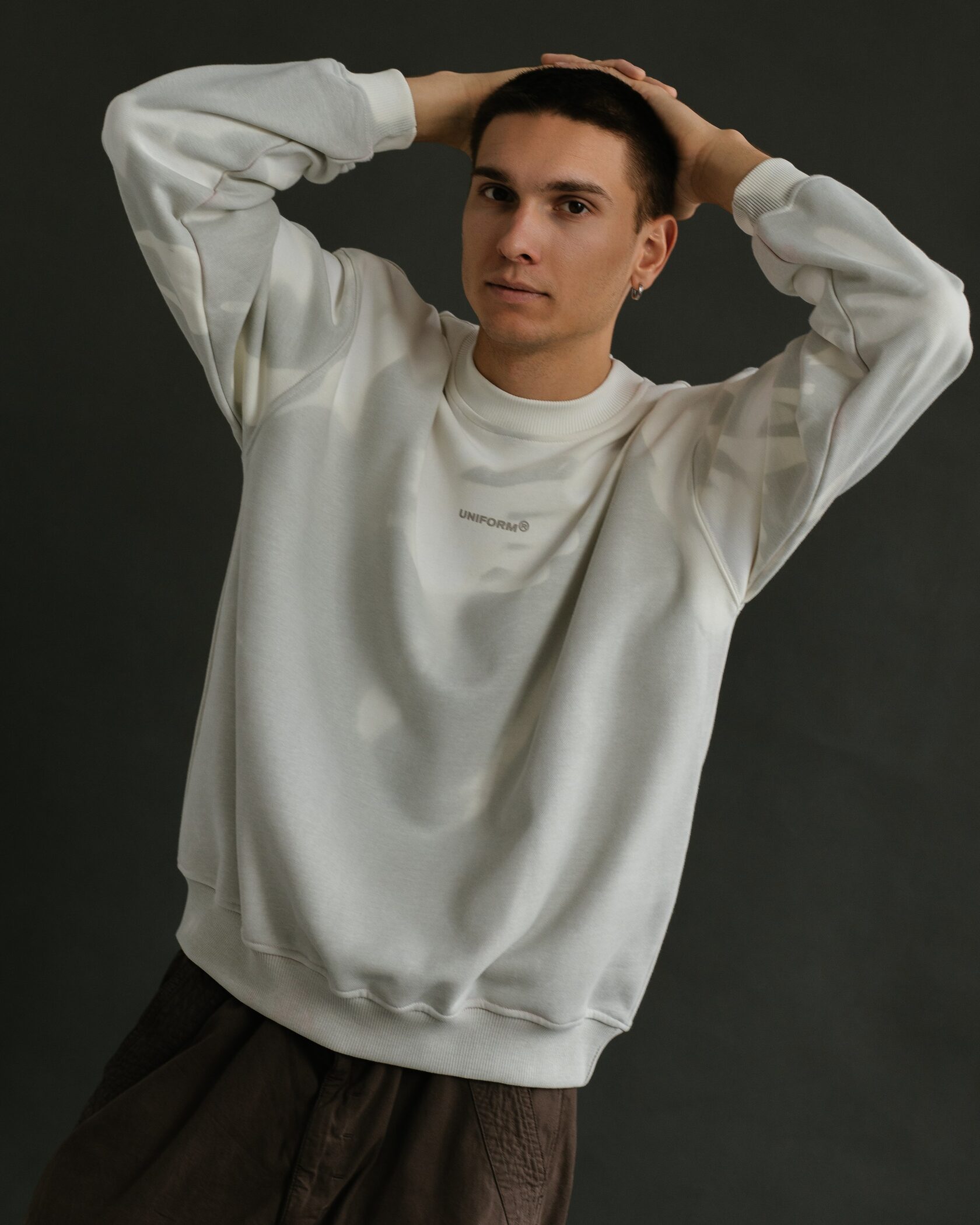 Свитшот изготовлен из классической хлопковой ткани с небольшим добавление синтетических волокон для комфортной эксплуатации и исключения растягивания. Дизайн выполнен в качестве минималистичного логотипа в цвет изделия, который становится виден при изменении цвета свитшота.