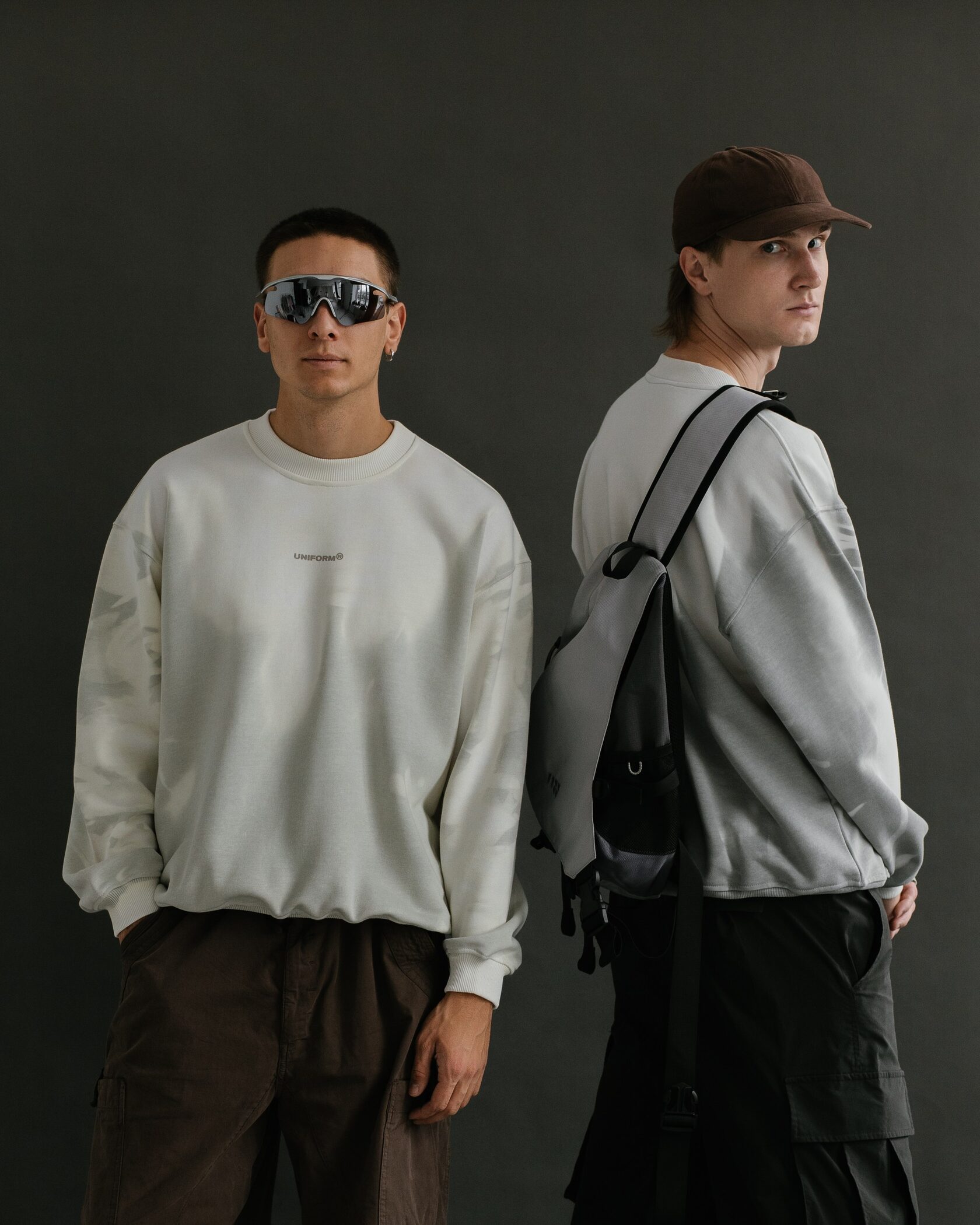 Термохромная ткань меняет цвет при температуре 31°, в холодном состоянии цвет изделия — темно-серый, в теплом состоянии цвет изделия — белый. На теле цвет изделия остается динамичным, так как в местах прилегания к телу свитшот меняет цвет.