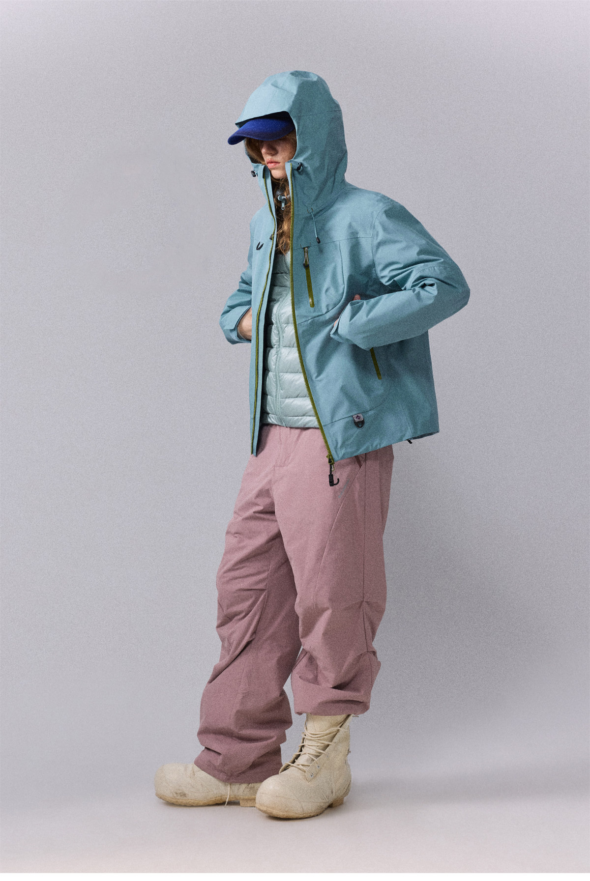 Внешняя ткань с водонепроницаемостью 20K/10K (водный напор 20 000 мм, паропроницаемость 10 000 г/м²/24 ч). Лёгкая и прочная, обеспечивает отличную защиту от непогоды. Внутренний слой — тёплый пуховик для зимы.